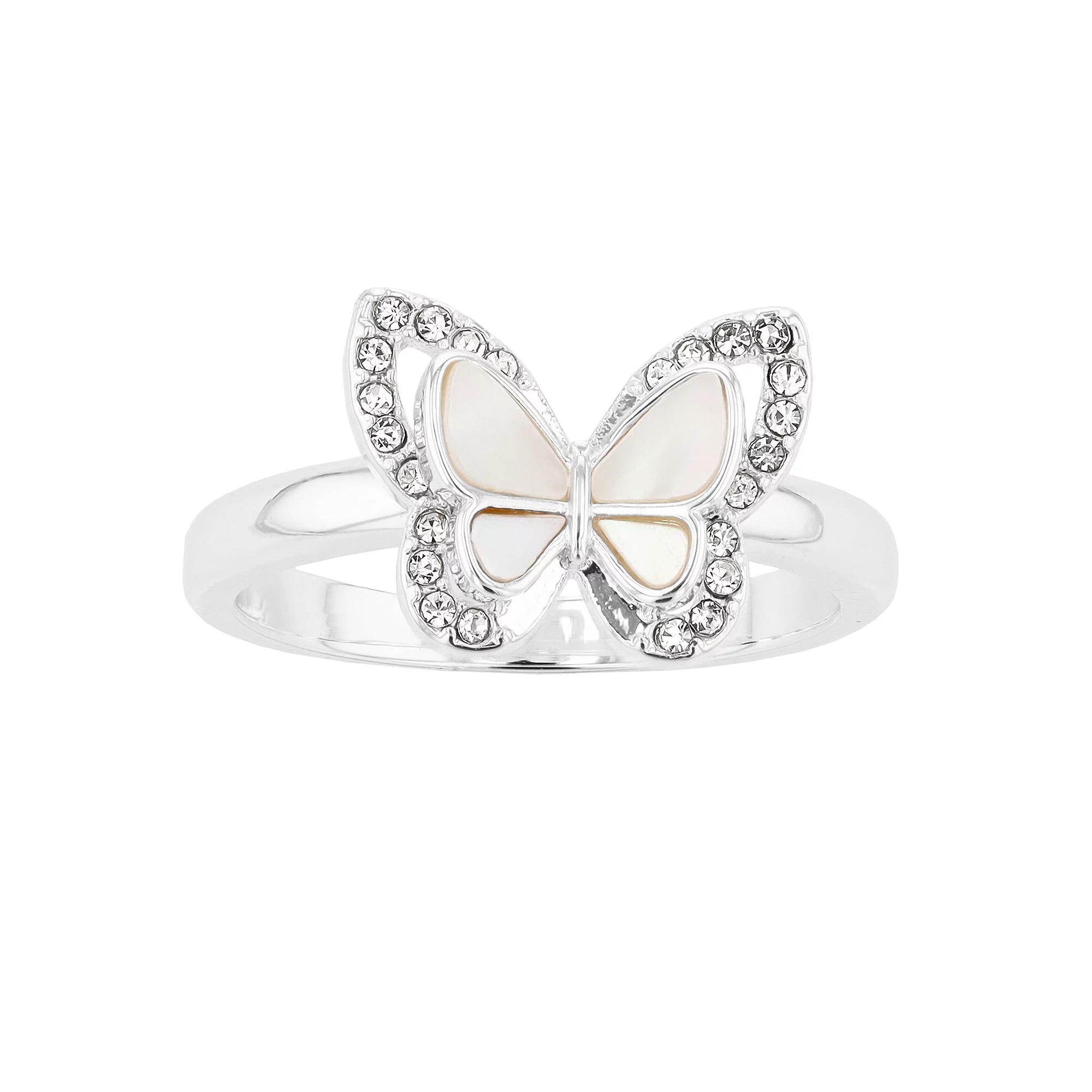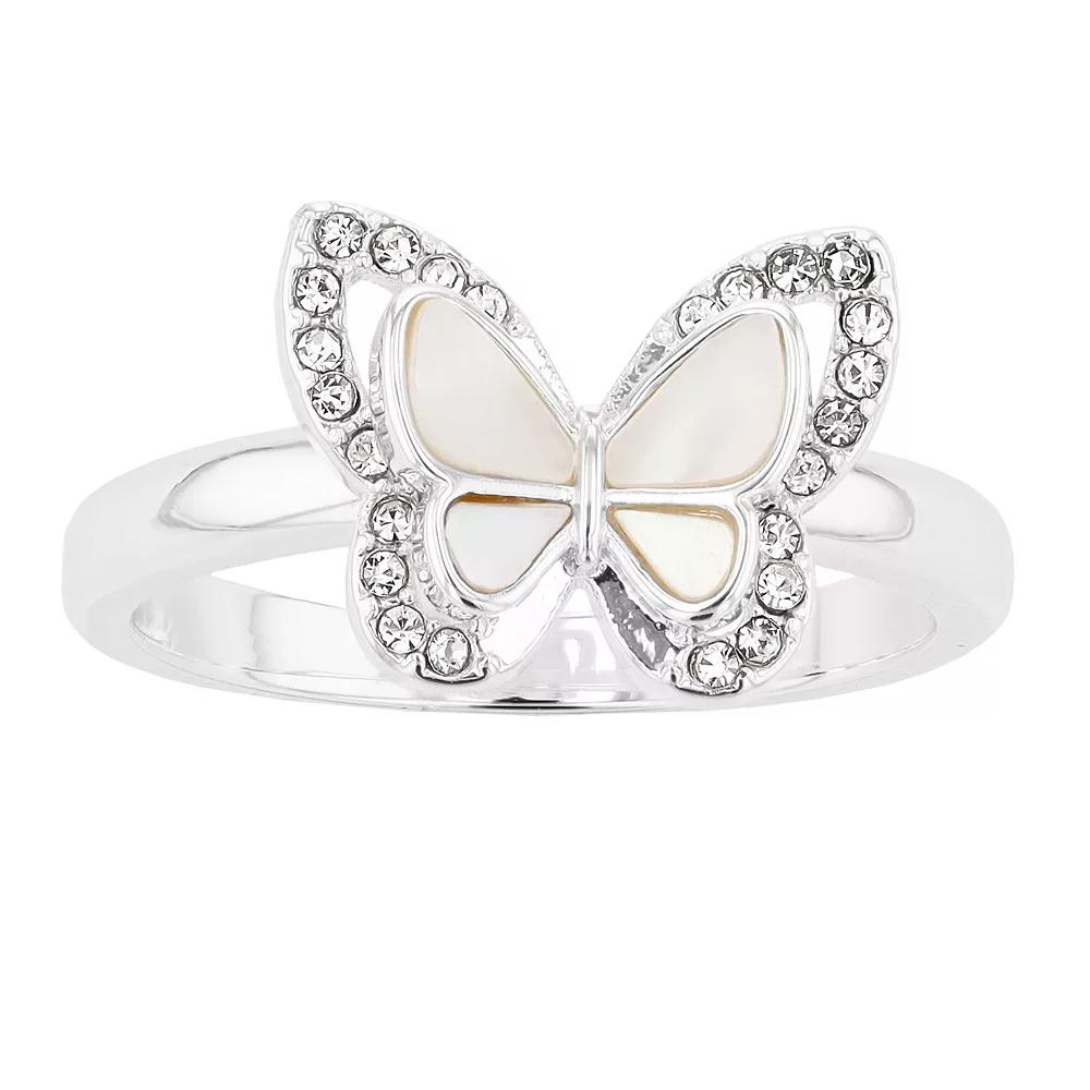 This silver tone City Luxe butterfly ring features genuine mother-of-pearl wings bordered with crystal pave, a lovely addition to any jewelry collection. This silver tone City Luxe butterfly ring features genuine mother-of-pearl wings bordered with crystal pave, a lovely addition to any jewelry collection. Width: 1.8 mm Metal: brass Plating: silver tone Finish: polished Additional details: mother-of-pearl & crystal accents Size: 7. Color: White. Gender: female. Age Group: adult.