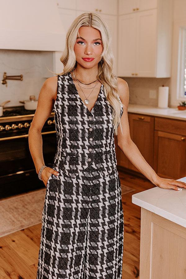 - Prepare to dazzle in this trendy vest! With its gorgeous buttons and shimmering material, it's perfect for adding a pop of glam to your look. Pair it with a cute mini skirt and boots for a head-turning, chic style! - Fully lined tweed material with shimmering tinsel woven throughout and a houndstooth pattern - A v-cut neckline - A sleeveless cut - Silver colored buttons with rhinestone embellishment - Low faux pocket cut accents - A relaxed silhouette that ends in an uneven hemline