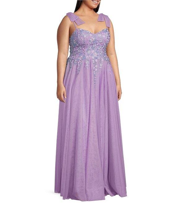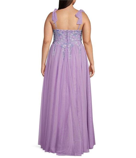 City Vibe Plus Sweetheart Neck Spaghetti Tie Straps Embroidered Applique Bodice Side Slit Gown