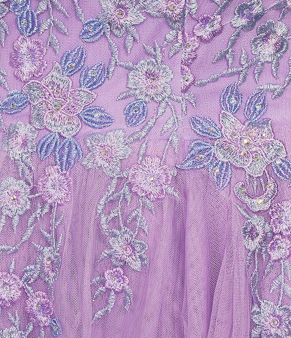 From City Vibe Plus, this dress features: Sweetheart neckline Sleeveless Spaghetti tie straps Zip back closure Embroidered appliques Shirred skirt Side front slit 63" length Polyester Dry clean Imported.