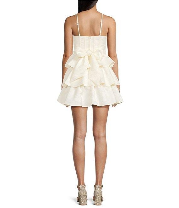 From City Vibe, this dress features: Scoop neckline Sleeveless Bustier bodice with ties at the back waist Tiered ruffles Zip back closure 33" center-back length Polyester/spandex; lined Dry clean Imported.