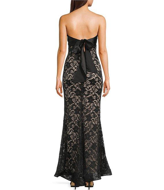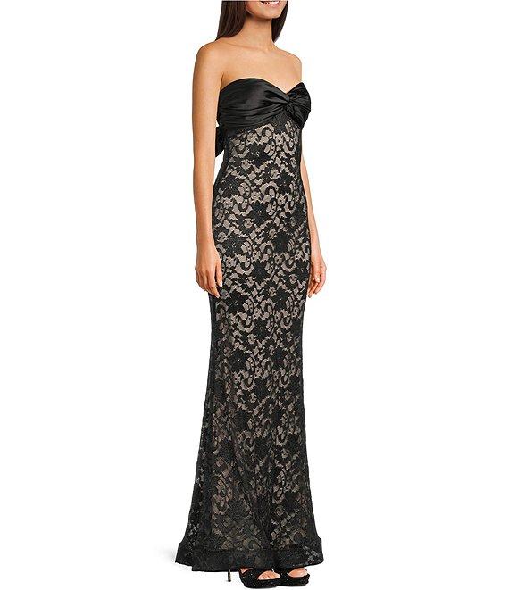 From City Vibe, this ballgown features: Sequin embellished lace fabric Strapless sweetheart neckline Twist-front bandeau bodice Horsehair hem Zip-back with tie closure 63" center-back length Polyester/spandex; lined Dry clean Imported.