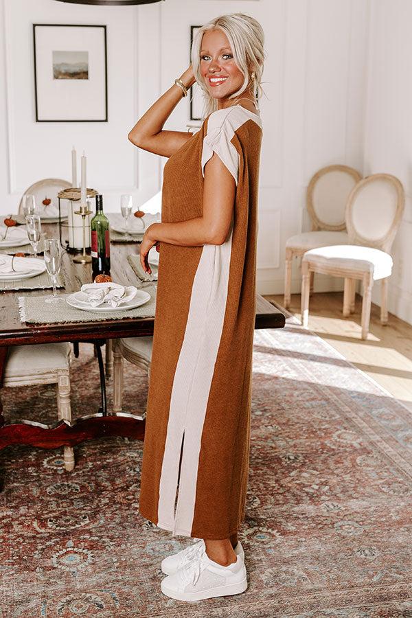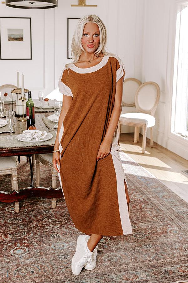 - Stay chic around the clock with this trendy dress! This cutie brings casual sophistication to your wardrobe, making it perfect for brunch dates or a day out. With its effortlessly stylish flow, you'll feel comfy while looking totally fabulous. - Unlined ribbed material with oatmeal colored trim - A round neckline - Short sleeves - Hidden side pockets - A relaxed silhouette that ends in a straight hemline with side slit accents