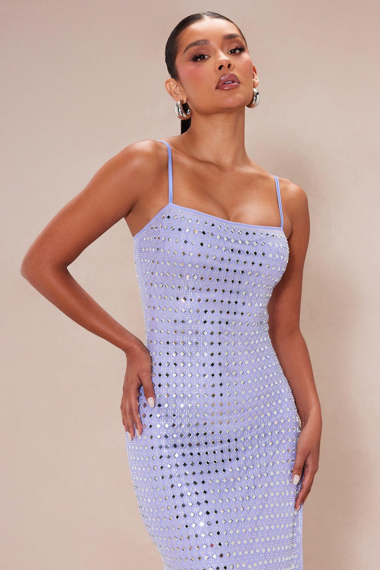 Available In Lavender. Embellished Mesh Maxi Dress Lined Rhinestones Invisible Back Zipper Hook And Eye Closure Some Stretch Side Slit Adjustable Straps Disclaimer: Due To The Rhinestone Placement, Each Garment Is Unique. Shell: 92% Polyester 8% Spandex Lining: 100% Polyester Imported