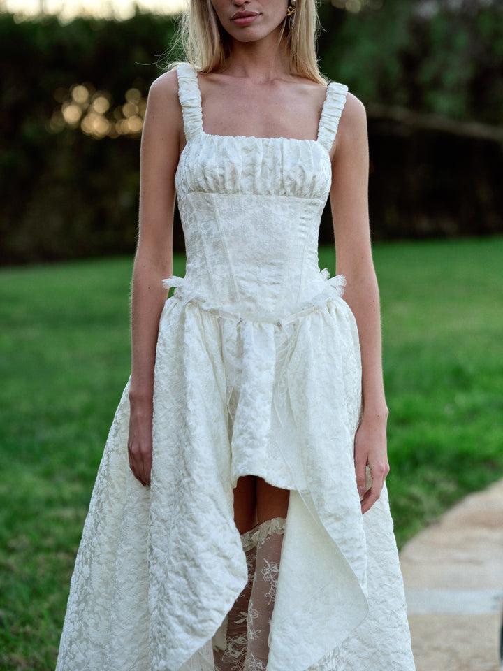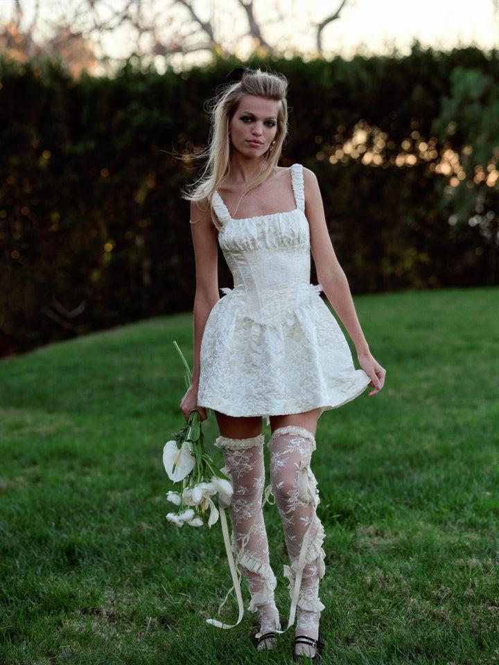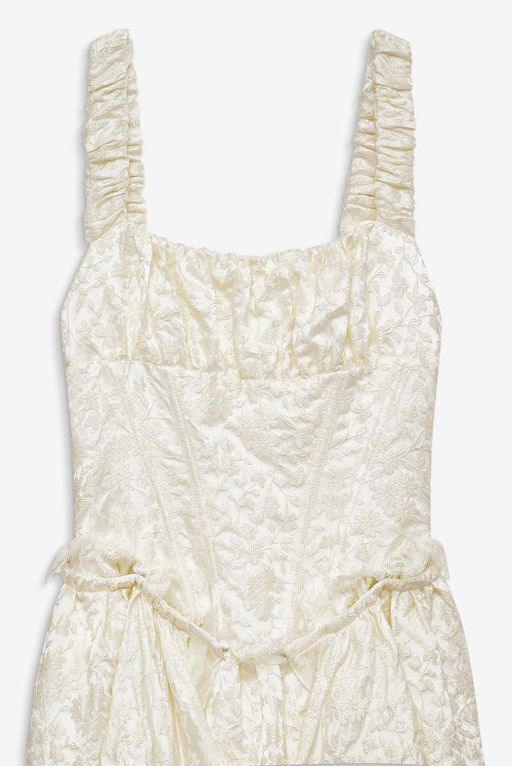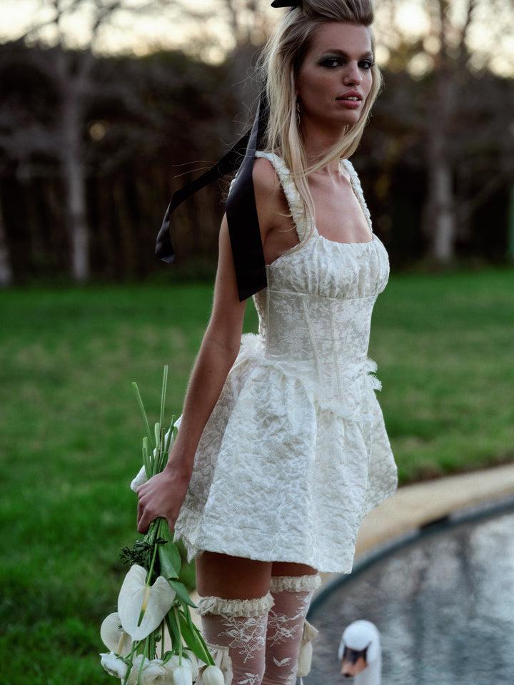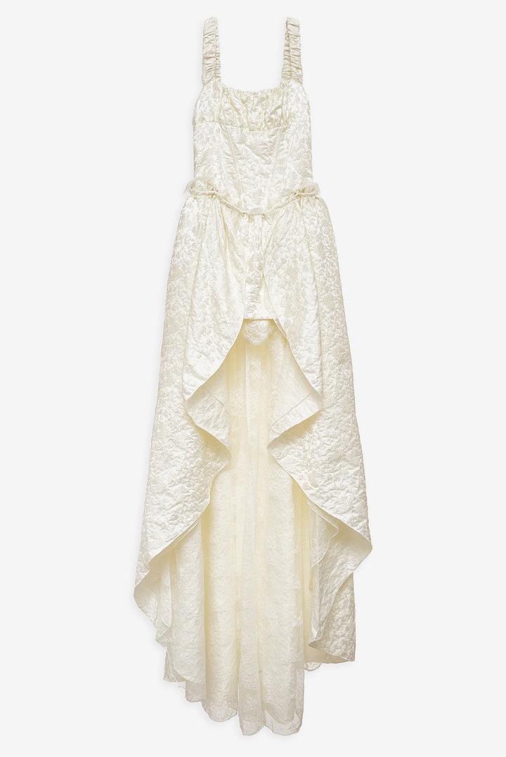 A wedding dress designed for your happily ever after—the Claire bridal gown is crafted in an exquisite textured jacquard. Featuring a ruched bust panel and a corset-like bodice with boning, this jacquard wedding dress converts into a marital mini by detaching its long train by the buttons that connect at the hips—making it a dream ceremony to bridal reception dress.