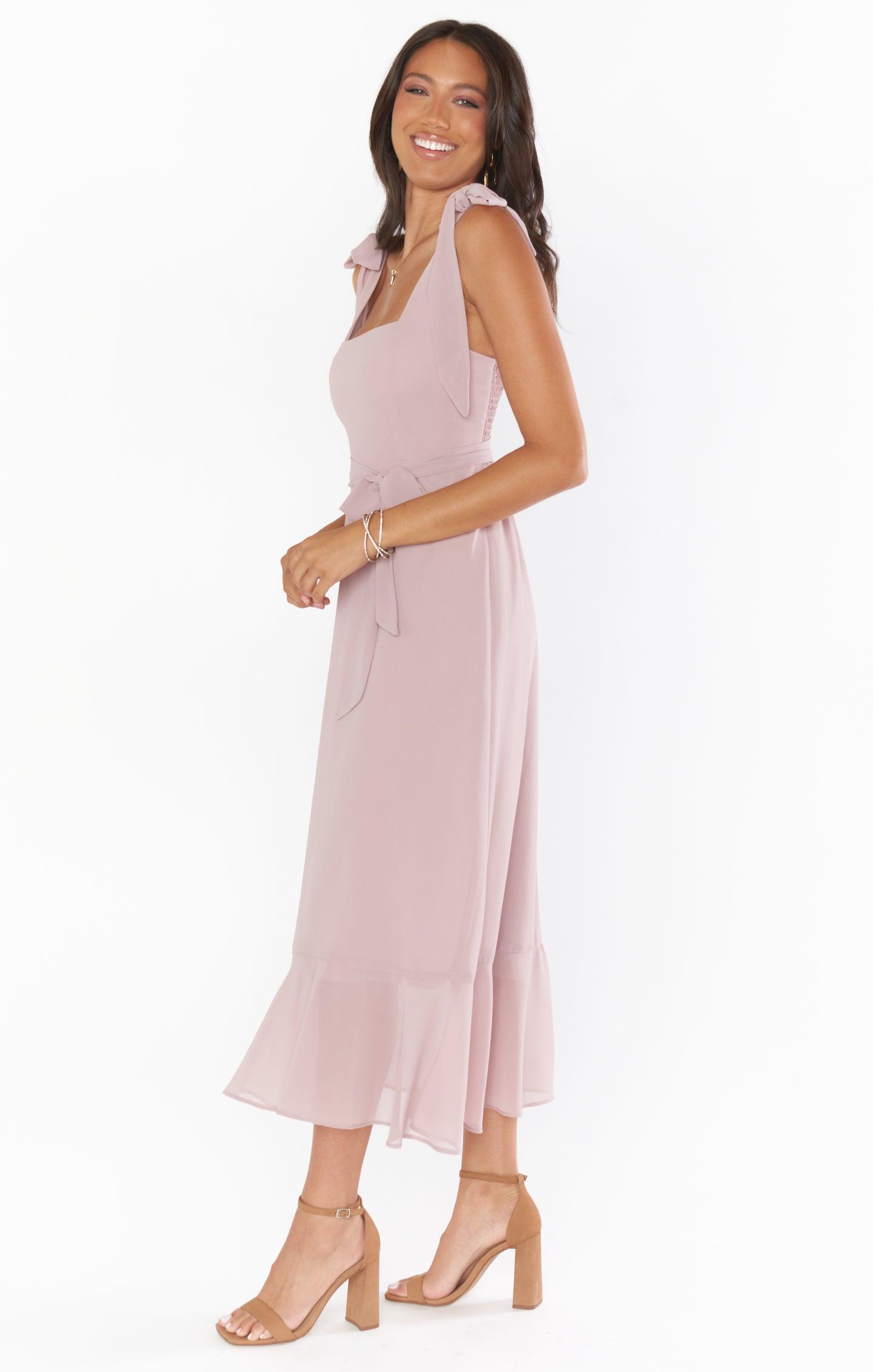 This square neck midi dress is filled with charm! The fitted bodice has a smocked back to achieve the perfect fit for a range of bust sizes met with a flowy midi skirt and side slit. Comes with a detachable waist sash as well as detachable bows for the straps! This is an effortless and versatile midi dress for all your 'maids or even a special event! Size Tip: TTS for a snug fit, or size up for more room!