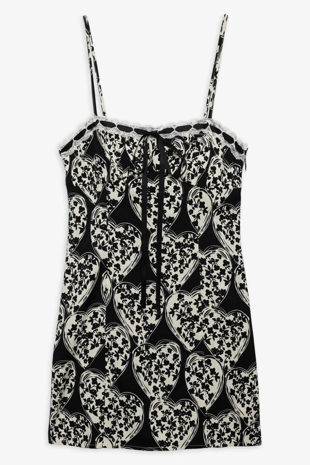 Celebrate the season of love with the charming retro Claire Mini Dress. Crafted in satin, this mini has an all-over 50s-inspired floral heart print, detailed with a slotted lace trim and ribbon along the neckline and an embroidered scallop hem. Perfect for a romantic evening, a night out with friends, or any kind of party!
