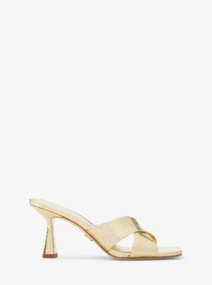 These Clara sandals by Michael Michael Kors are designed in snake-embossed metallic leather, highlighting crisscrossed straps and a square-cut open toe. This pair is set on a svelte heel. Leather upper Open toe Slips on Polyurethane/viscose/polyester lining Rubber sole Imported SIZE Heel: about 3.5 (85mm). Womens Shoes - Contemporary Shoes > Michael Michael Kors > Saks Fifth Avenue > Barneys. MICHAEL Michael Kors. Color: Pale Gold. Size: 5.5.