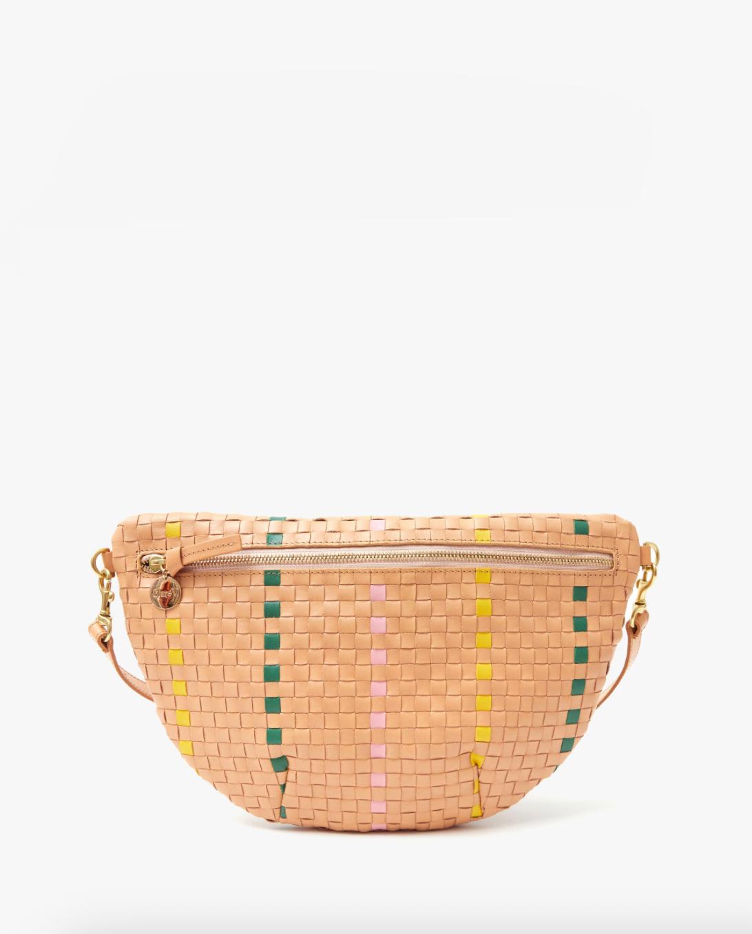 Expertly crafted in Bangladesh, the Clare V. Grande Fanny bag features a stylish bisque woven checker design with a striped pattern. Its 12 3/4 inch width and 8 inch height make it the perfect size for all your essentials, while the adjustable and detachable 14-hole strap offers versatile wearing options. Lined in soft chambray with a blush zipper, this bag exudes both functionality and fashion.