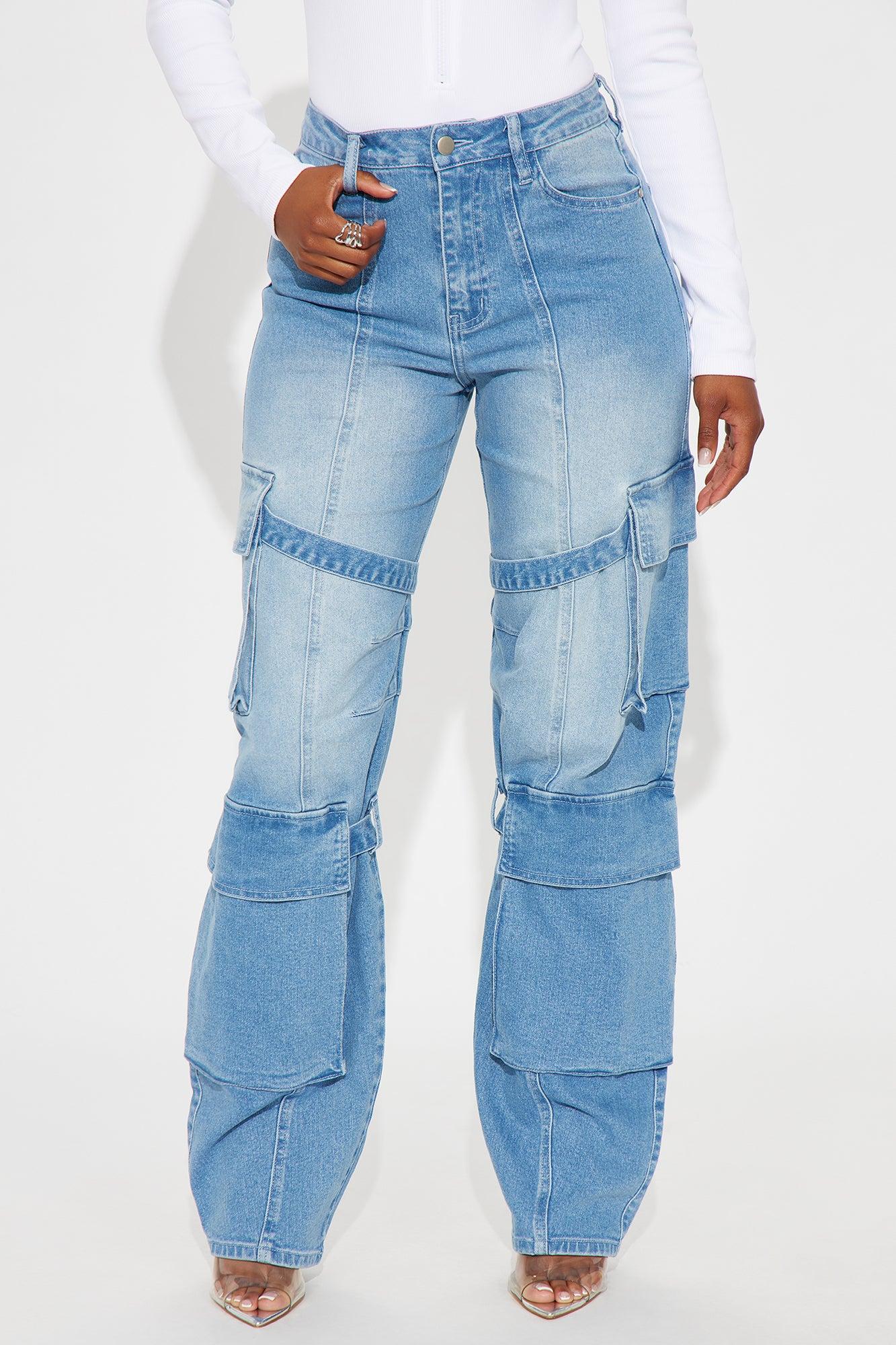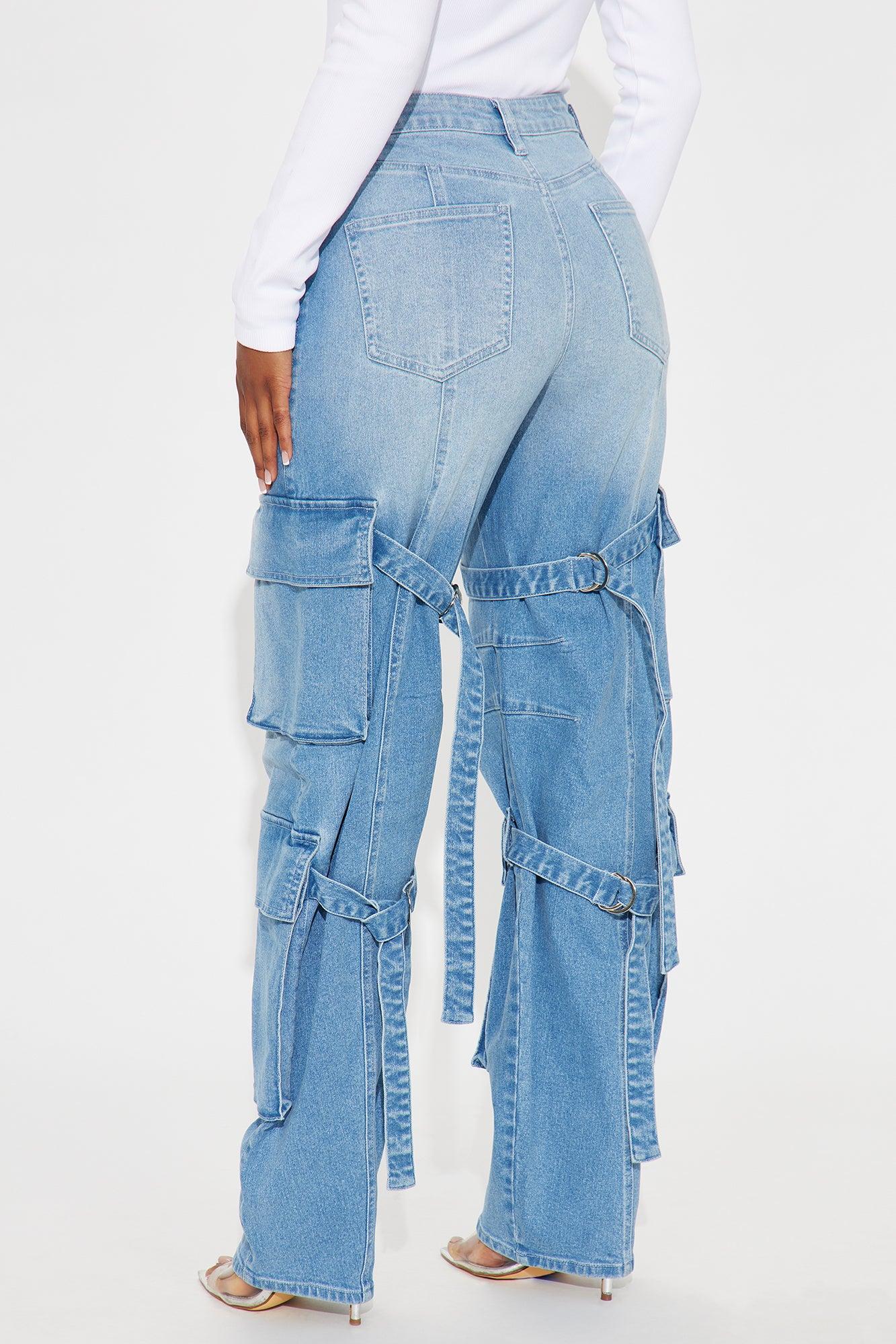 Available In Medium Wash. Straight Leg Jean 5 Pocket Cargo Pockets Strappy Detail 11" High Rise 33" Inseam Medium Stretch Disclaimer: Due To The Specialized Wash Process, Each Garment Is Unique. 94% Cotton 4% Polyester 2% Spandex Imported California Proposition 65WARNING: Cancer and Reproductive Harm - www.P65Warnings.ca.gov.