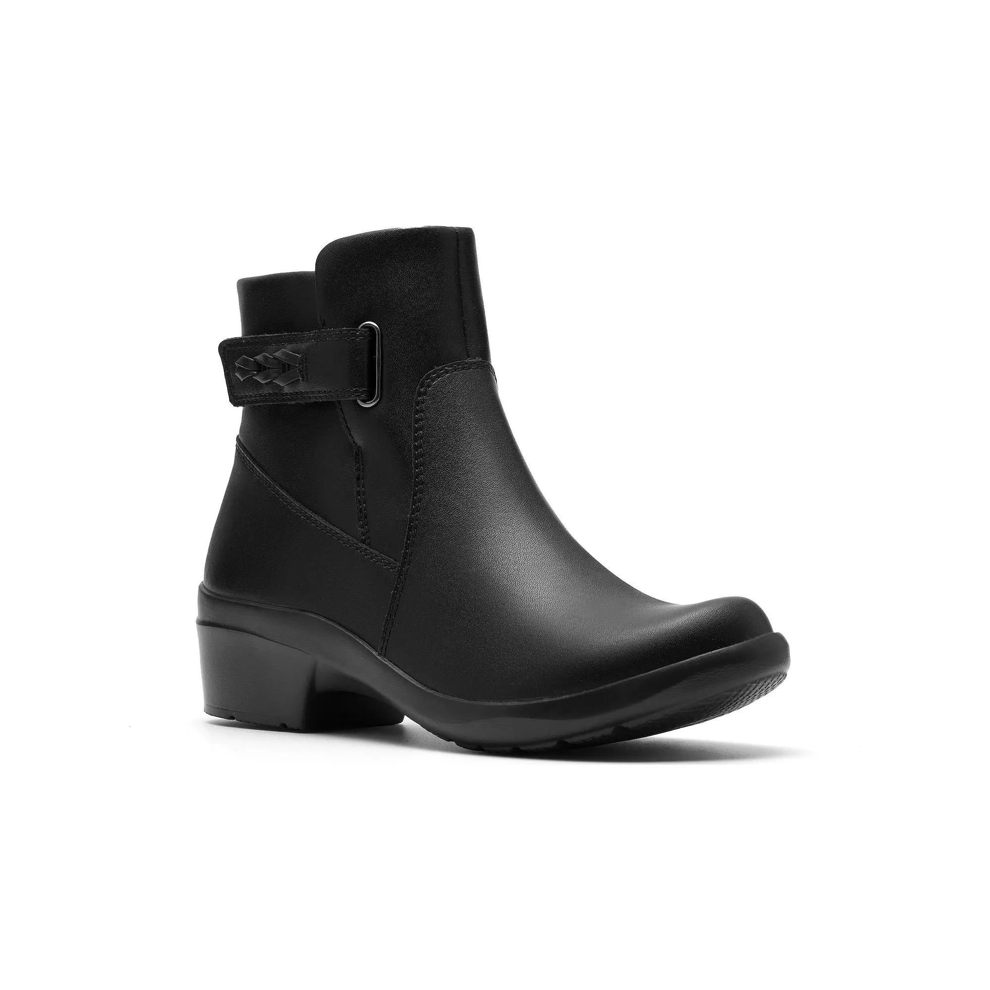 Discover the perfect blend of style and practicality with these ankle boots from Clarks. Featuring a sleek design and eye-catching strap detail, they effortlessly transition from a day at the office to an evening out, ensuring you'll look chic and feel comfortable no matter the occasion. Click this FOOTWEAR GUIDE to find the perfect fit and more! - https://www.kohls.com/feature/shoesizeguide.jsp. FEATURES: Stylish strap detail for added visual interest, Durable leather construction for long-lasting wear. DETAILS: Round toe, Hook-and-loop tape closure, Heel height: 1.77 inches, Imported. FIT & SIZE: Boot shaft circumference: 9 inches, Ankle height: 4.3 inches. MATERIAL & CARE: Leather upper, Textile lining, Polyurethane footbed, EVA outsole, Spot clean. Size: 8. Color: Black Leather. Gender: female. Age Group: adult.
