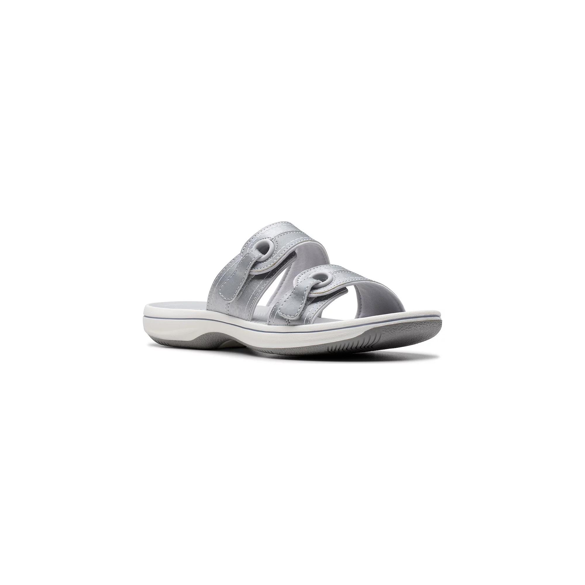 Step into summer with these Clarks Breeze Maye Cloudstepper Women's Flip Flop Sandals. Click this FOOTWEAR GUIDE to find the perfect fit and more!Step into summer with these Clarks Breeze Maye Cloudstepper Women's Flip Flop Sandals. Click this FOOTWEAR GUIDE to find the perfect fit and more!FEATURES Double band design upper Impact-absorbing and cushioned footbed for all day comfort Durable rubber outsole Slip-on for easy on and offDETAILS Synthetic upper Textile lining EVA midsole TPR outsole Open toe Slip-on EVA footbed 1.2-in. heel Spot clean Imported Size: 8. Color: Silver. Gender: female. Age Group: adult.