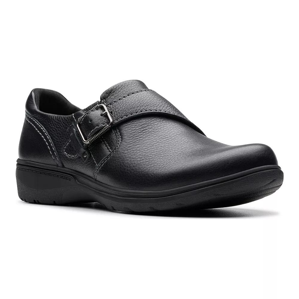 Step into style with these Clarks® Carleigh Jazz Women's Leather Shoes. Click this FOOTWEAR GUIDE to find the perfect fit and more! - https://www.kohls.com/feature/shoesizeguide.jsp. FEATURES: 5mm Ultimate Comfort footbed delivers lasting support, Super-grippy, wear-anywhere sole that keeps steps steady, Classic strap closure lends a secure, custom fit, Durable black leather upper- Smooth textile sock and lining feel soft against the foot. DETAILS: Leather Upper, Textile Lining, TPR Outsole, Round toe,Moc toe, Slip-on, 1.38 in. heel, Spot clean, Imported. Size: 10. Gender: female. Age Group: adult.