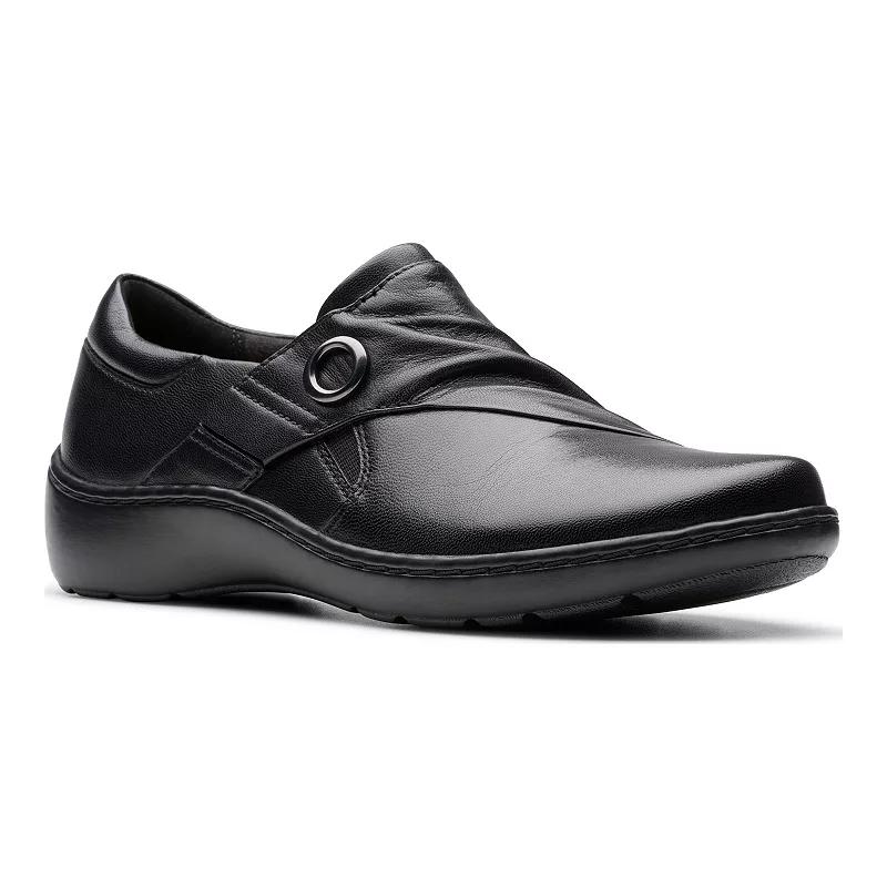 Step out in style with these Clarks Cora Aubrie Womens Leather Shoes.Click this FOOTWEAR GUIDE to find the perfect fit and more! Step out in style with these Clarks Cora Aubrie Womens Leather Shoes. Click this FOOTWEAR GUIDE to find the perfect fit and more! SHOE CONSTRUCTION Leather upper Textile lining TPR outsoleSHOE DETAILS Round toe Slip-on Premium leather upper- Molded Cushion Feel footbed 1.78-in. heel Spot clean Imported Size: 7.5. Color: Black. Gender: female. Age Group: adult.