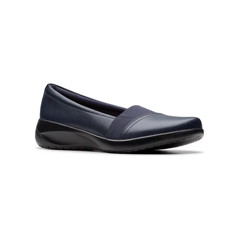Discover effortless elegance with Clarks' latest addition, perfect for your busy lifestyle. Featuring a polished design complemented by stretchy panels for easy slip-on wear, these shoes provide all-day comfort, making them the ideal choice for both office days and casual outings. Click this FOOTWEAR GUIDE to find the perfect fit and more! - https://www.kohls.com/feature/shoesizeguide.jsp. FEATURES: Ultimate Comfort foam footbed offers all-day support, Stretch panels assist easy foot entry, Breathable Microfiber footbed lining. DETAILS: Leather upper, Textile lining, TPR outsole, Round toe, Slip-on, Polyurethane footbed, Slip-resistant outsole, Heel height: 1.57 inches, Spot clean, Imported. Size: 9. Color: Navy Leather. Gender: female. Age Group: adult.