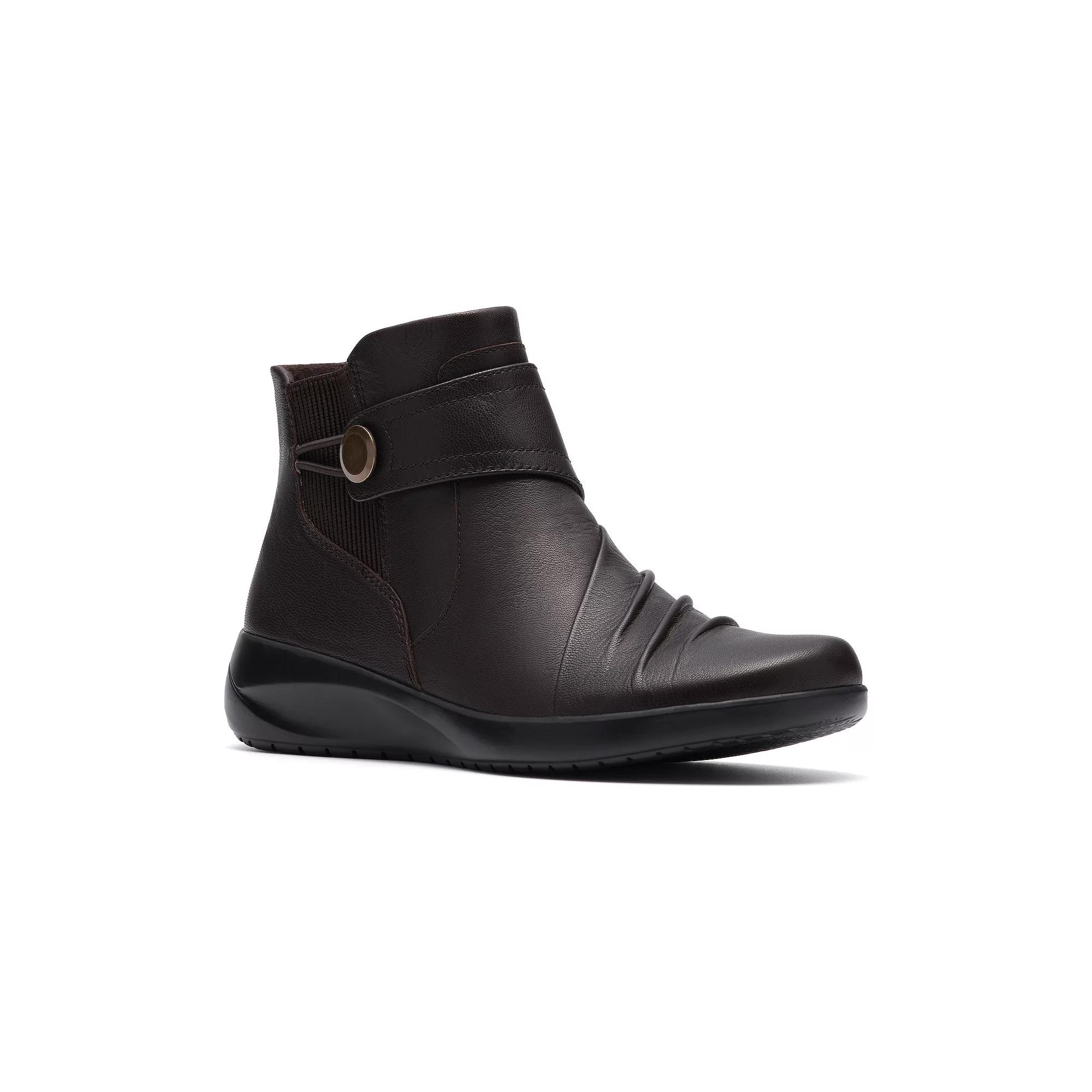 Experience the perfect blend of style and comfort with Clarks Kaetlyn Sara ankle boots, designed to transition effortlessly from office meetings to after-work events. With their sophisticated silhouette, cushioned footbed, and flexible sole, these boots offer all-day support while ensuring you look polished and professional. Click this FOOTWEAR GUIDE to find the perfect fit and more! - https://www.kohls.com/feature/shoesizeguide.jsp. FEATURES: Premium leather upper with rouching detail, Ultimate Comfort foam footbed offers all-day support, Flexible TPR (thermoplastic rubber) sole delivers ultimate underfoot traction, Ankle shaft detail. DETAILS: Leather upper, Textile lining, TPR outsole, Almond toe, Zipper closure, Foam footbed, Flex groove outsole, 1.57 inch heel height, Shaft height: 3.74 inches, Shaft circumference: 8.66 inches, Spot clean, Imported. Size: 8.5. Color: Chocolate Leather. Gender: female. Age Group: adult.