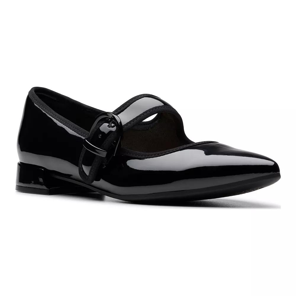 Step out in style with these Clarks Natalyn May Women's Leather Mary Jane Shoes. Click this FOOTWEAR GUIDE to find the perfect fit and more! - https://www.kohls.com/feature/shoesizeguide.jsp. SHOE CONSTRUCTION: Leather/Synthetic upper, Textile lining, TPR outsole, Pointed toe. SHOE DETAILS: Buckle closure, .98-in. heel, Spot clean, Imported. Color: Black Patent. Gender: female. Age Group: adult.