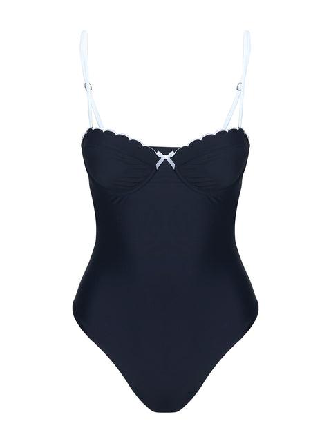 Contrast one piece Scalloped trim, underwire bust, bow detail, ruched bust, high-cut leg, cheeky bottoms, adjustable straps Good stretch, fully lined Princess Polly Lower Impact Main: 80% reclaimed nylon 20% spandex, Lining: 90% polyester 10% elastane Rinse in cold water before & after wear
