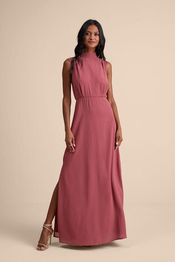 Your energy will be regal in the Lulus Classic Elegance Rusty Rose Chiffon Sleeveless Mock Neck Maxi Dress! Airy woven chiffon shapes this gorgeous dress that has a mock neckline and a sleeveless bodice with gathered fabric detailing. A lightly elasticized waist tops a stunning maxi skirt complete with twin side slits. Keyhole opening and double button closure at back. Hidden back zipper/clasp.