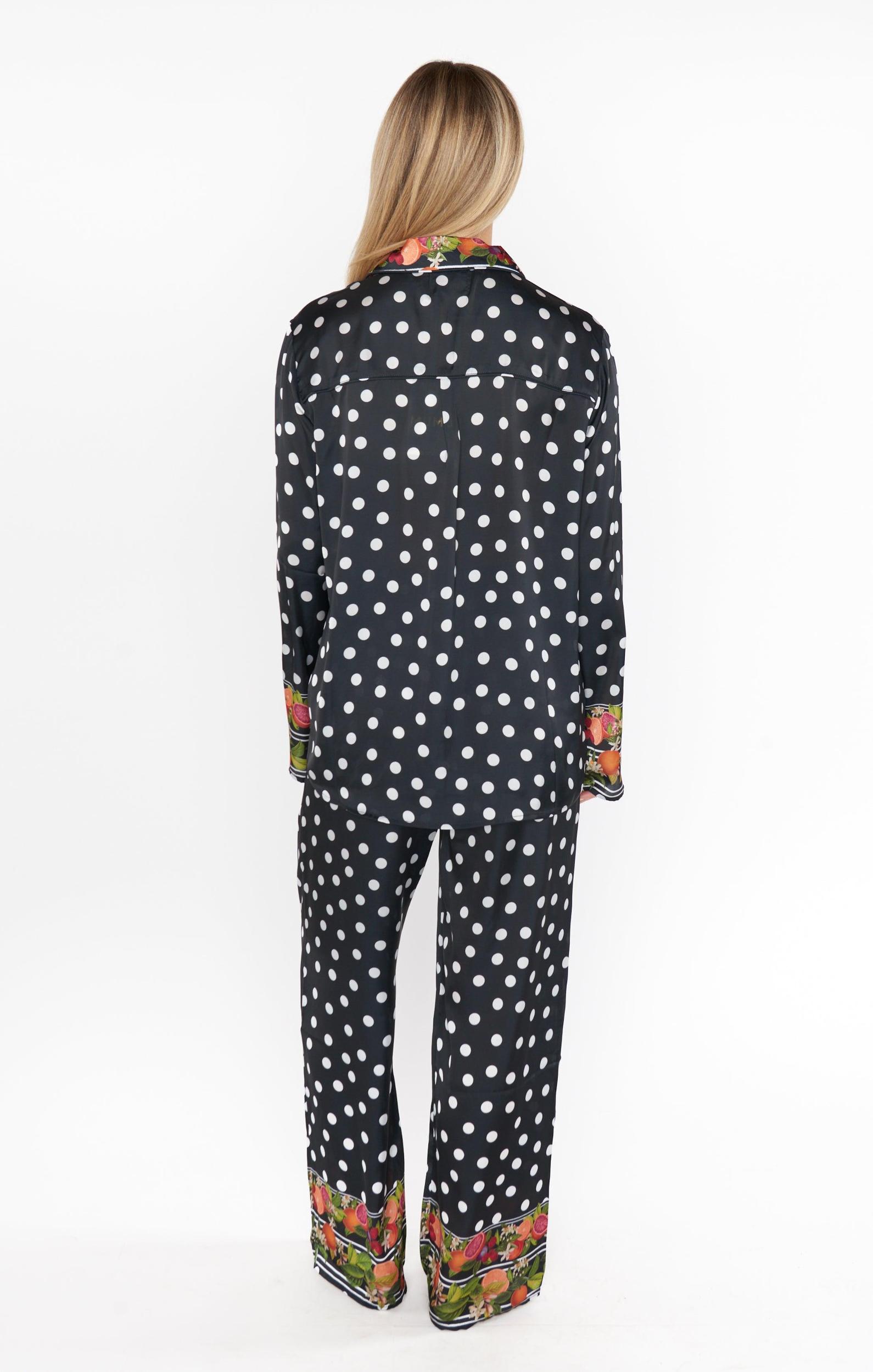 Sleep tight in these super silky button down pajamas! Sold as a set, these tropical polka dot printed pjs have a drawstring and elastic waist.