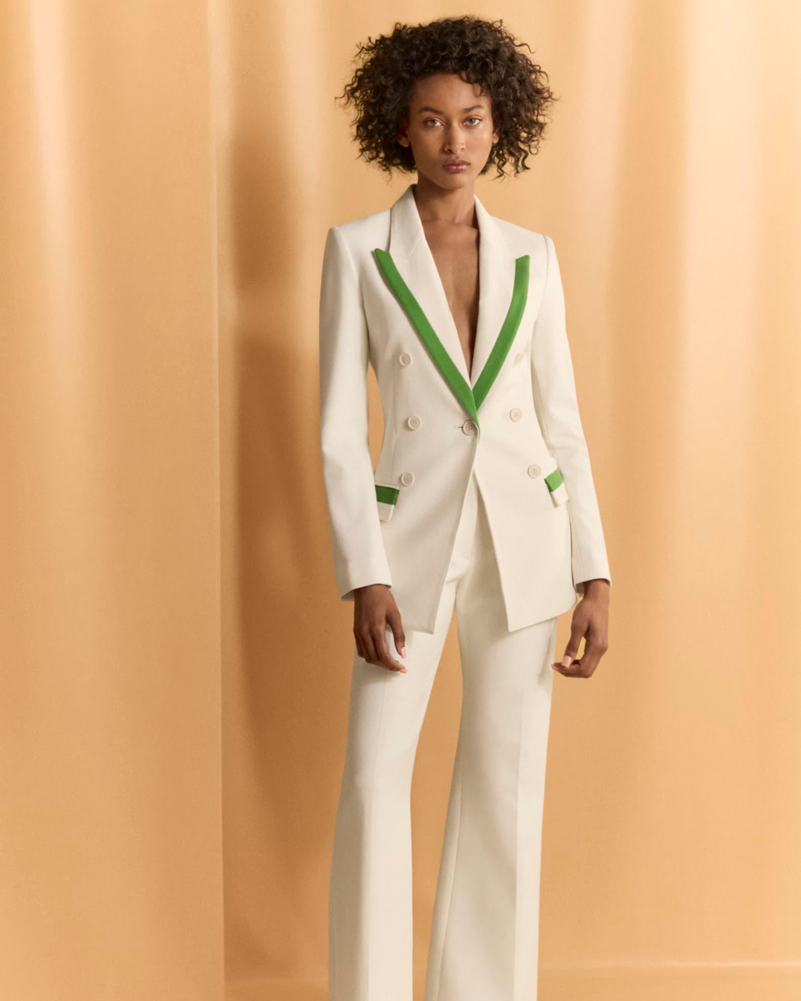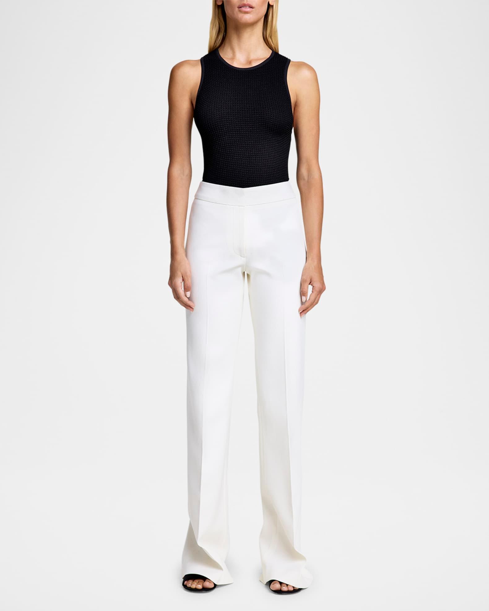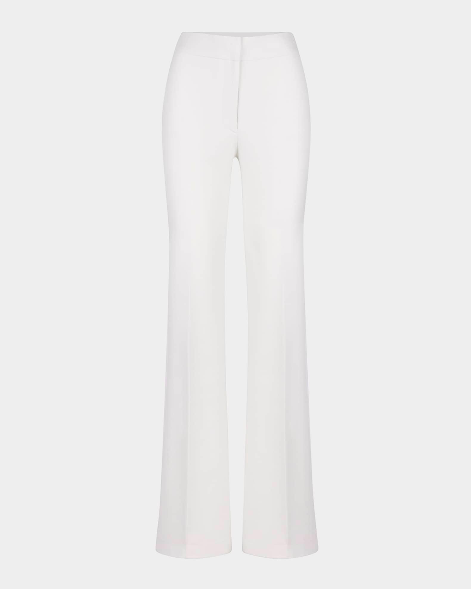 Smythe classic pants crafted from a seasonless stretch fabrication with a subtle a-line shape Approx. 34" inseam Mid rise sits high on hip Back welt pockets Full length Straight legs Hidden hook/zip fly Polyester/viscose/elastane Made in Canada