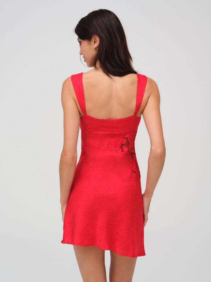 Inspired by the eternally chic style, the Claudia red mini dress has timeless appeal. Cut to an asymmetrical silhouette with appliquéd embroidery and jacquard cut-away detailing, this red dress is finished with additional romantic details like lace trims and a fixed satin rosette at the center-front neckline.