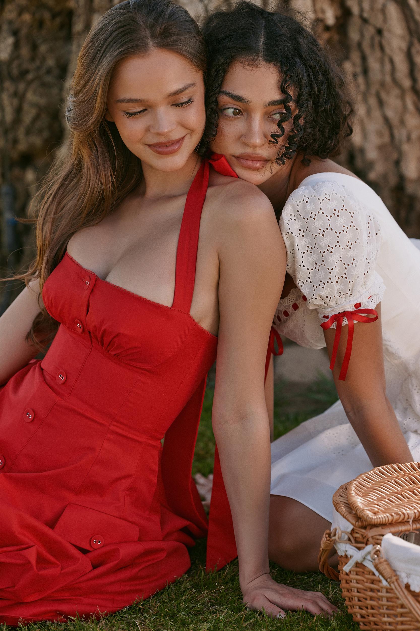 Where drama meets romance – let's have a moment for the 'Claudia' dress. It's beautifully constructed from stretch Pima cotton to a carefree midi silhouette that moves with your body. The halter neck straps tie at the back of the neck to complement the square neckline that's detailed with a picot trim. The sublime fit has a vintage feel with ruching in the bust and boned structuring at the waistline. It continues to gracefully fall to an A-line shape that skims over the hips. Finished with buttons down the front and two functional button pockets – the 'Claudia' dress is pure perfection.