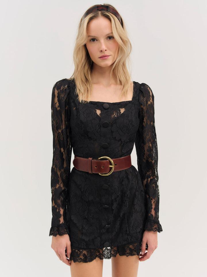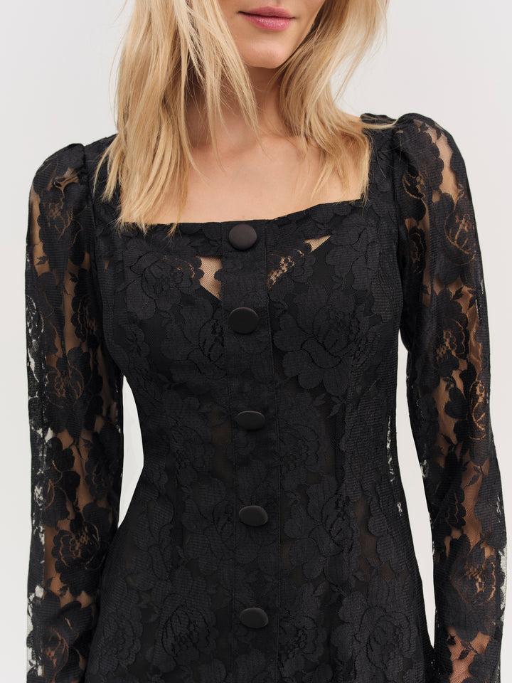 Ultra-feminine and hopelessly romantic, the Claudia rose lace long sleeve mini dress has a timelessly chic feel. Crafted in sheer lace, this black mini dress features a square neckline, functional buttons, and lace trims.