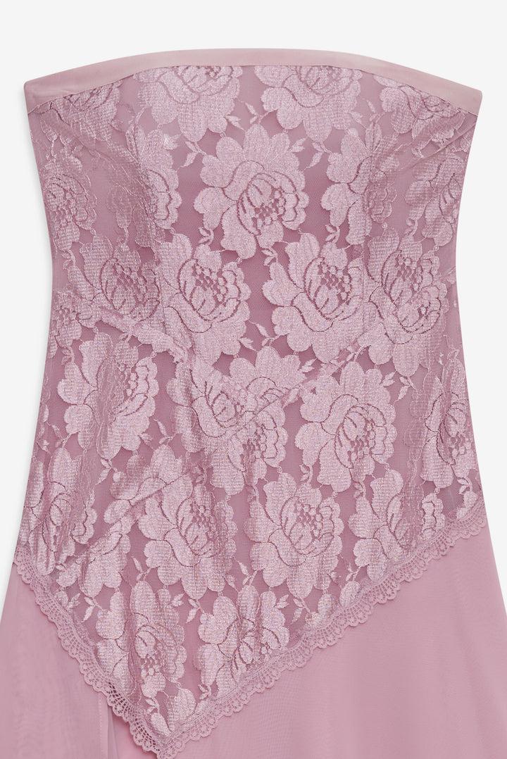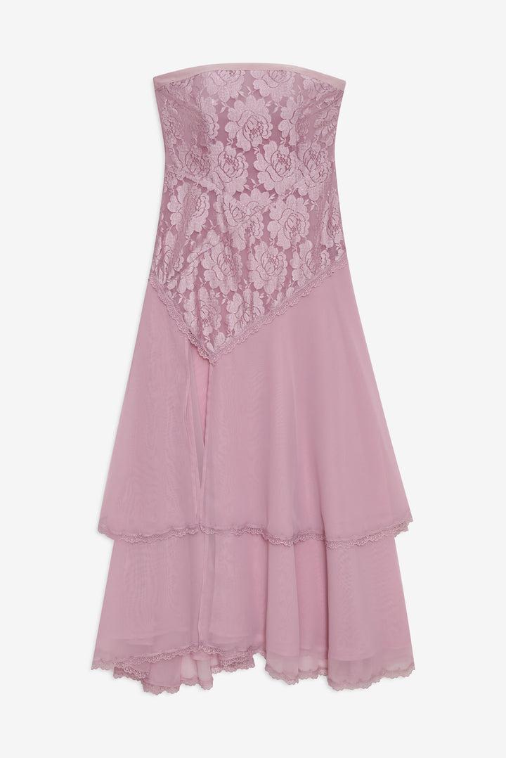 Ultra-feminine and hopelessly romantic, the Claudia Rose lace strapless maxi dress has a timelessly chic feel. Crafted in a sweet lace and lightweight chiffon, this pink maxi dress features an asymmetrical drop-waist, a tiered skirt, and a slit at right leg. It's adorned with a lace trim throughout.