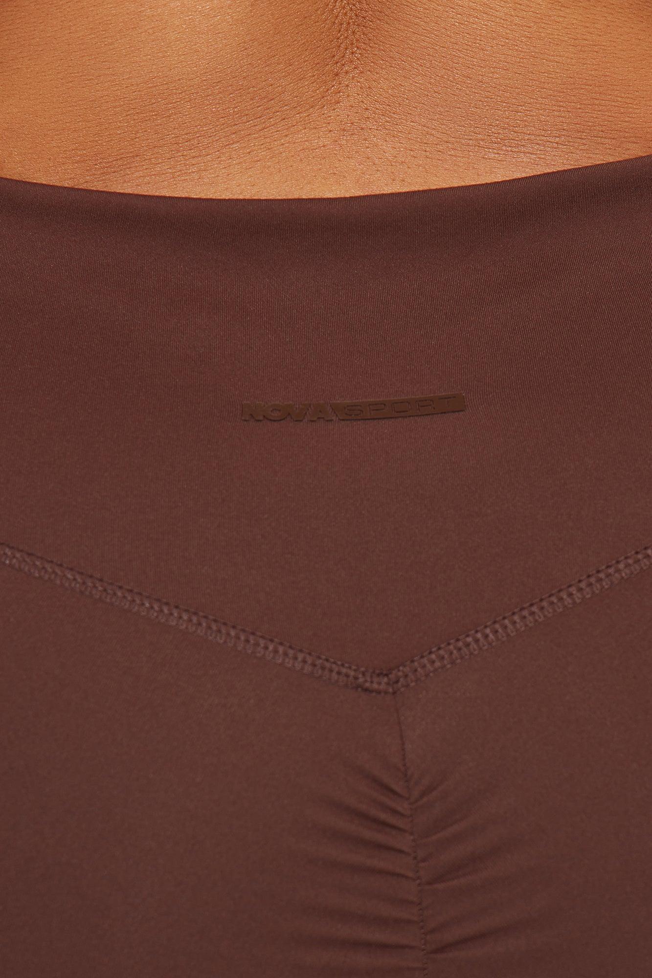 Available In Chocolate. High Waisted Yoga Pant Elastic Waistband Ruched Detail Super Soft Medium Impact Stretch Pair With "Body Sculpt Super Soft Sports Bra" 77% Polyester 23% Spandex Imported