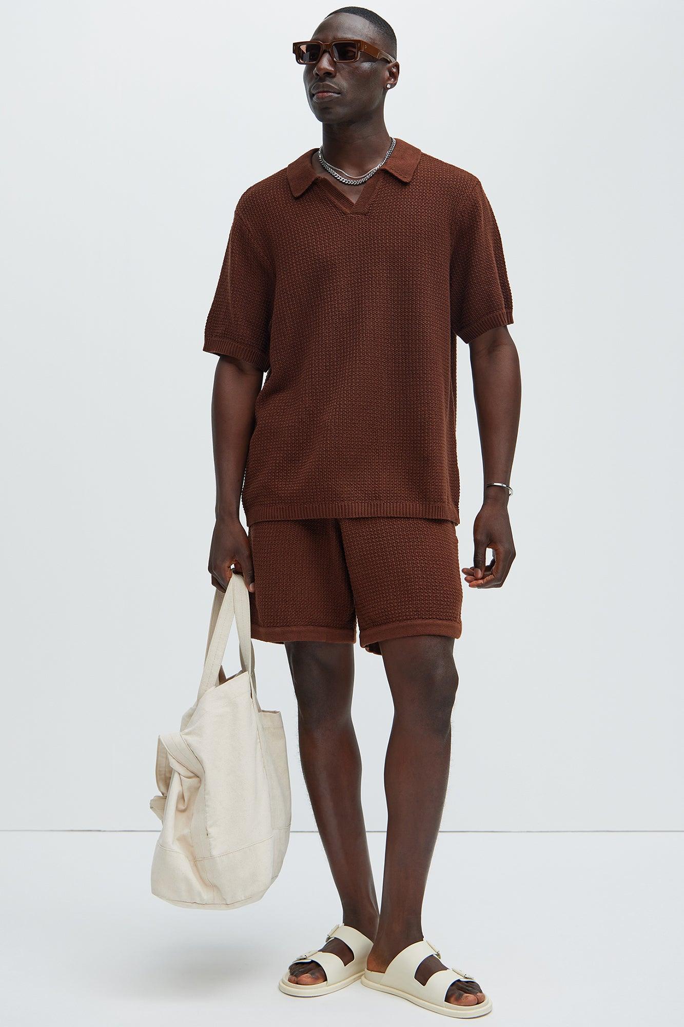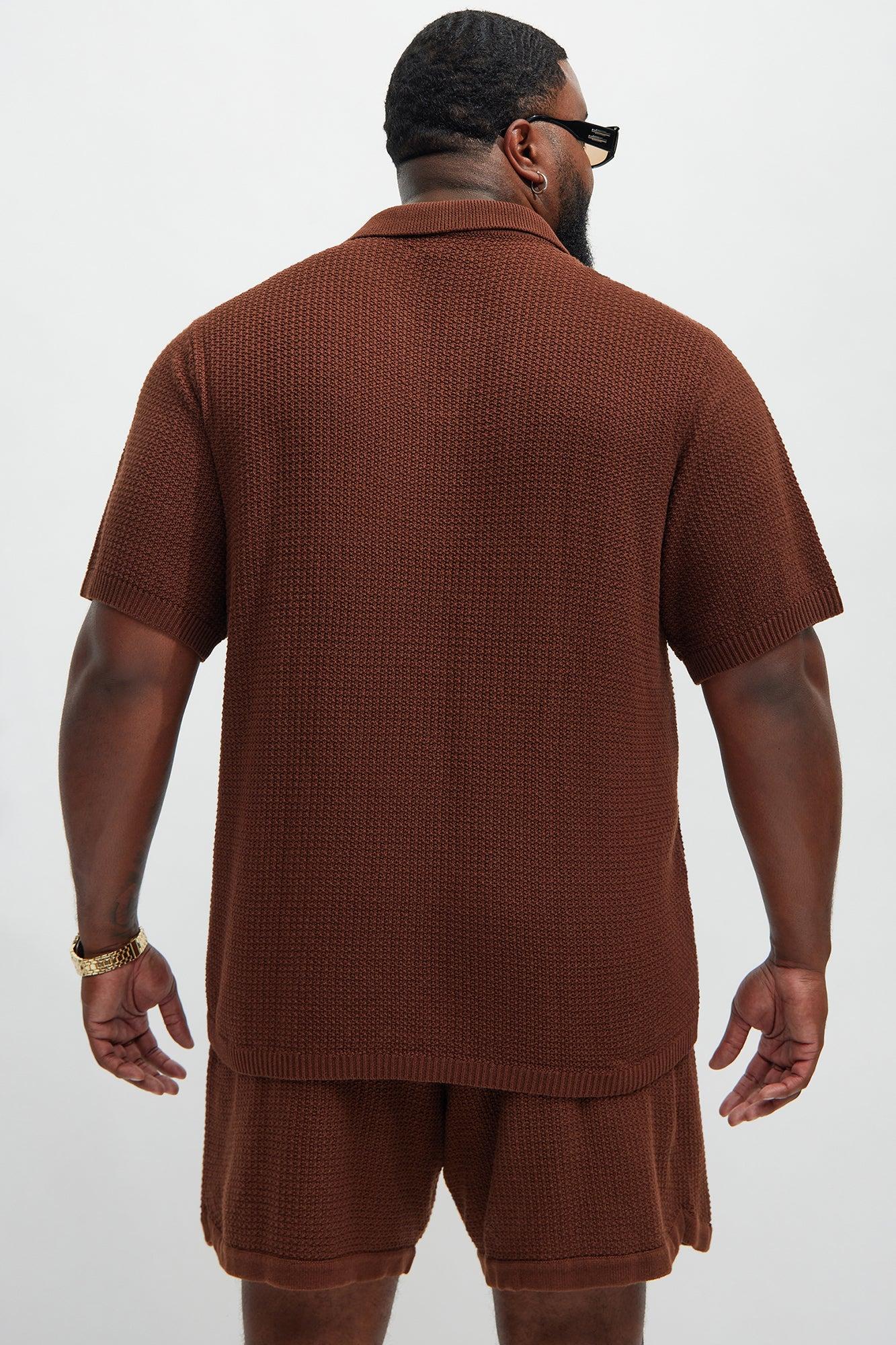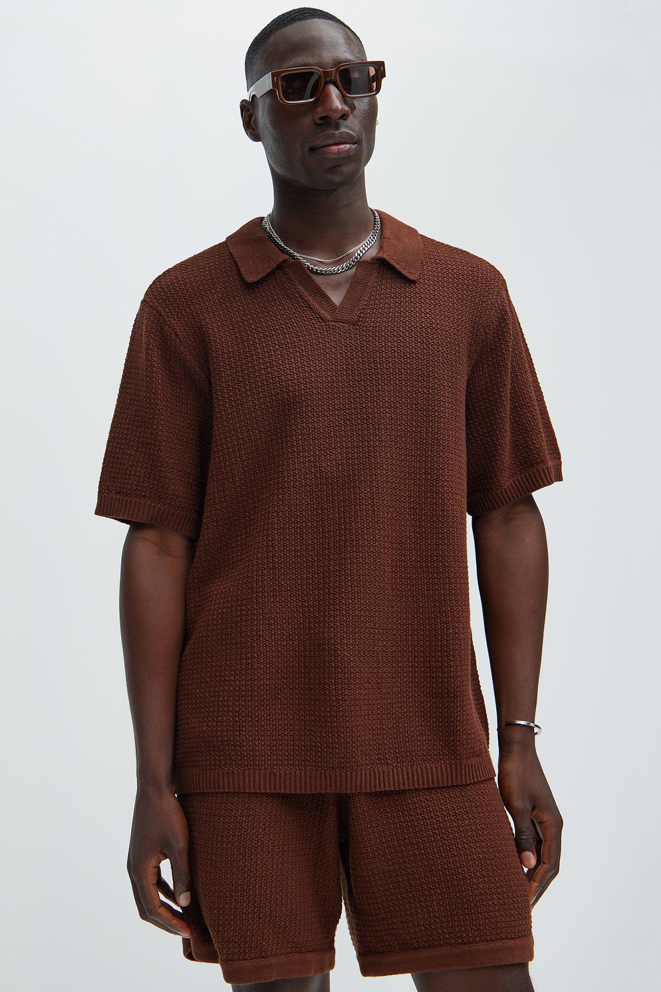 Available In Dark Brown. Fold Down Collar Textured Detail Short Sleeve Pair With "Clay Textured Shorts" Shell:100% Cotton Imported California Proposition 65 WARNING: Cancer and Reproductive Harm - www.P65Warnings.ca.gov.