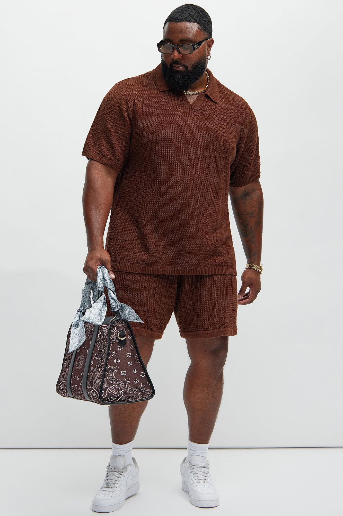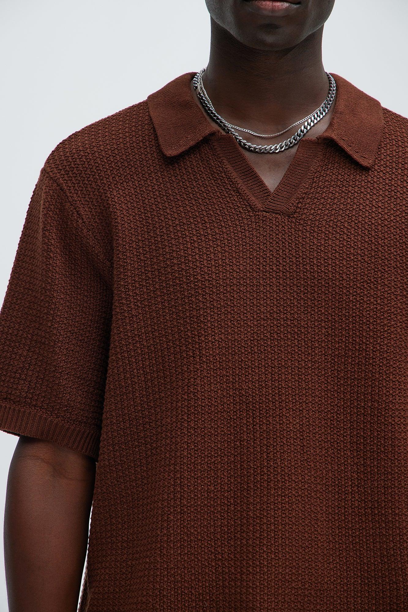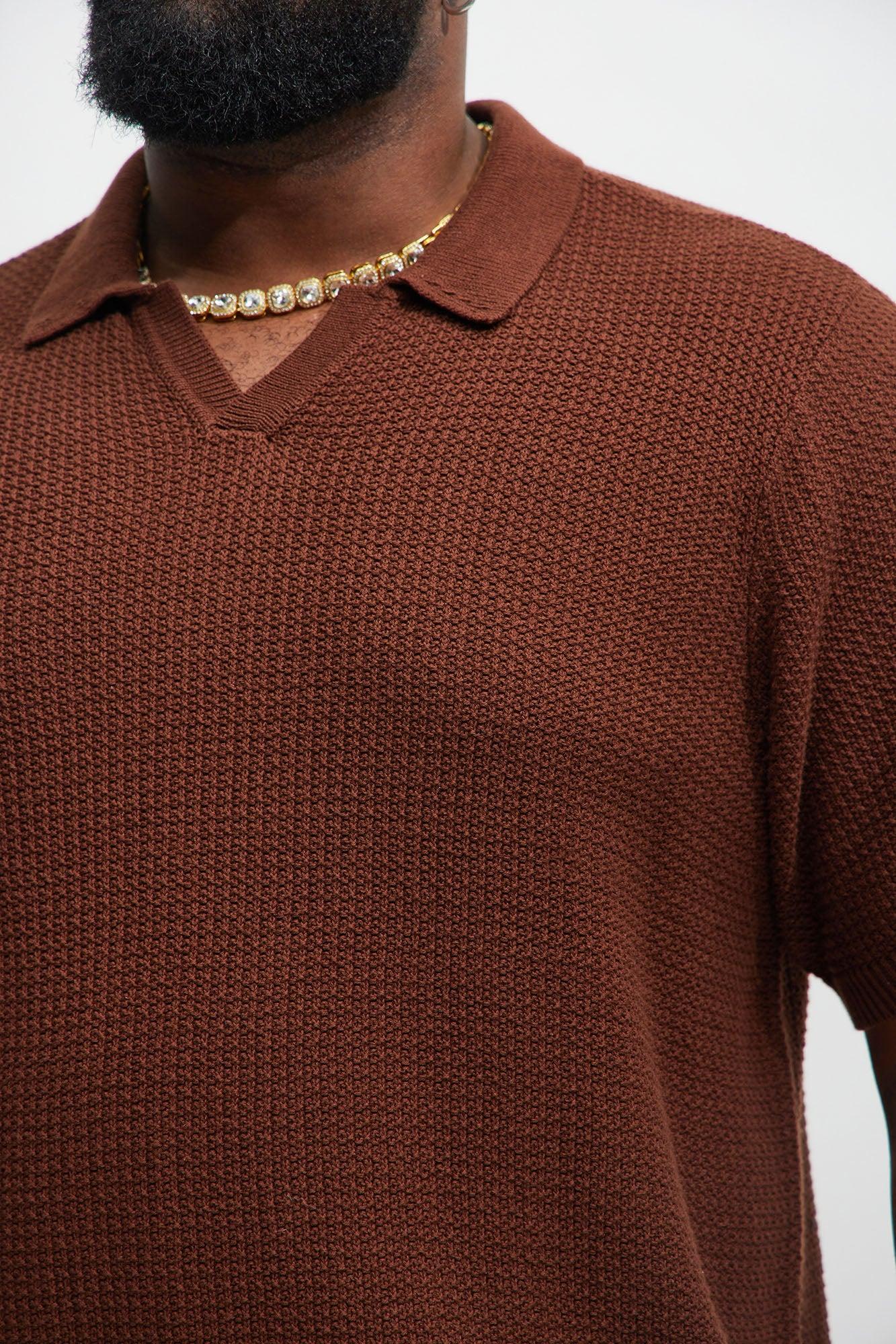 Available In Dark Brown. Fold Down Collar Textured Detail Short Sleeve Pair With "Clay Textured Shorts" Shell:100% Cotton Imported California Proposition 65 WARNING: Cancer and Reproductive Harm - www.P65Warnings.ca.gov.