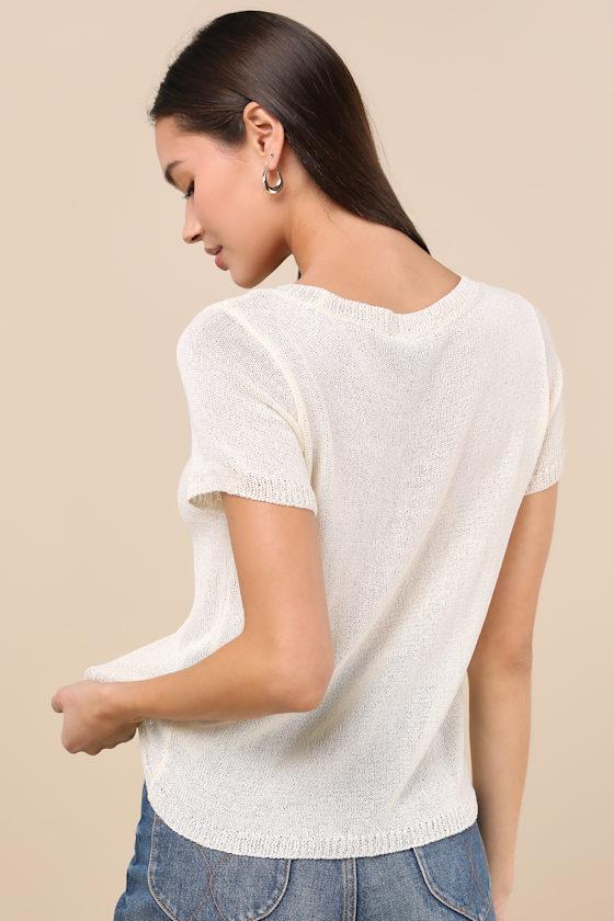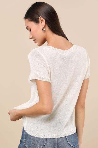 Upgraded style is easy to achieve when you've got pieces like the Lulus Clean Aesthetic Cream Short Sleeve Sweater Top! Lightweight knit fabric shapes this versatile top that has a subtle boat neckline, framed by classic short sleeves. Relaxed-fit bodice finishes with ribbed knit at the hem, neckline, and cuffs.