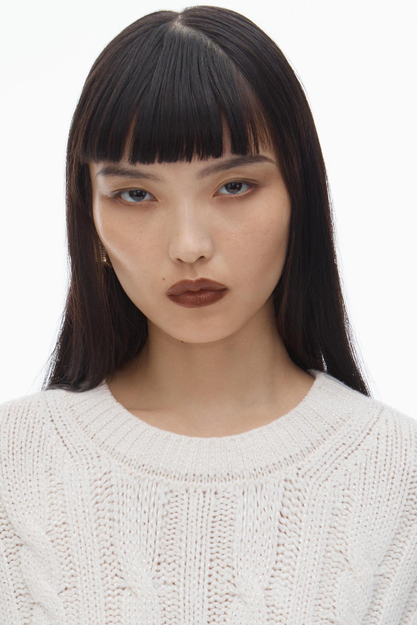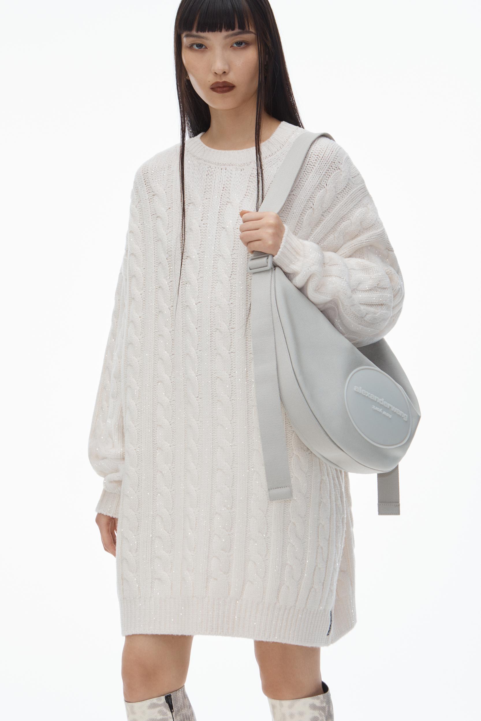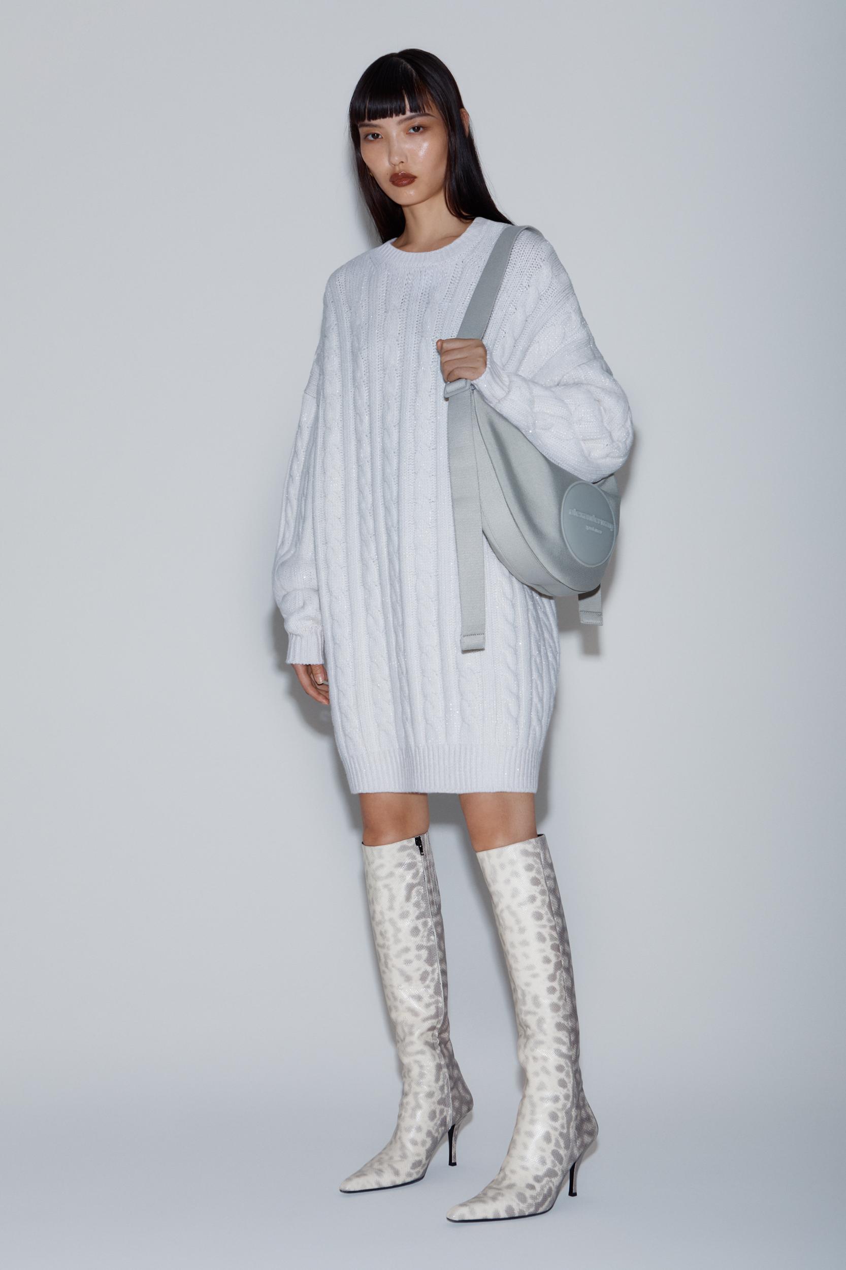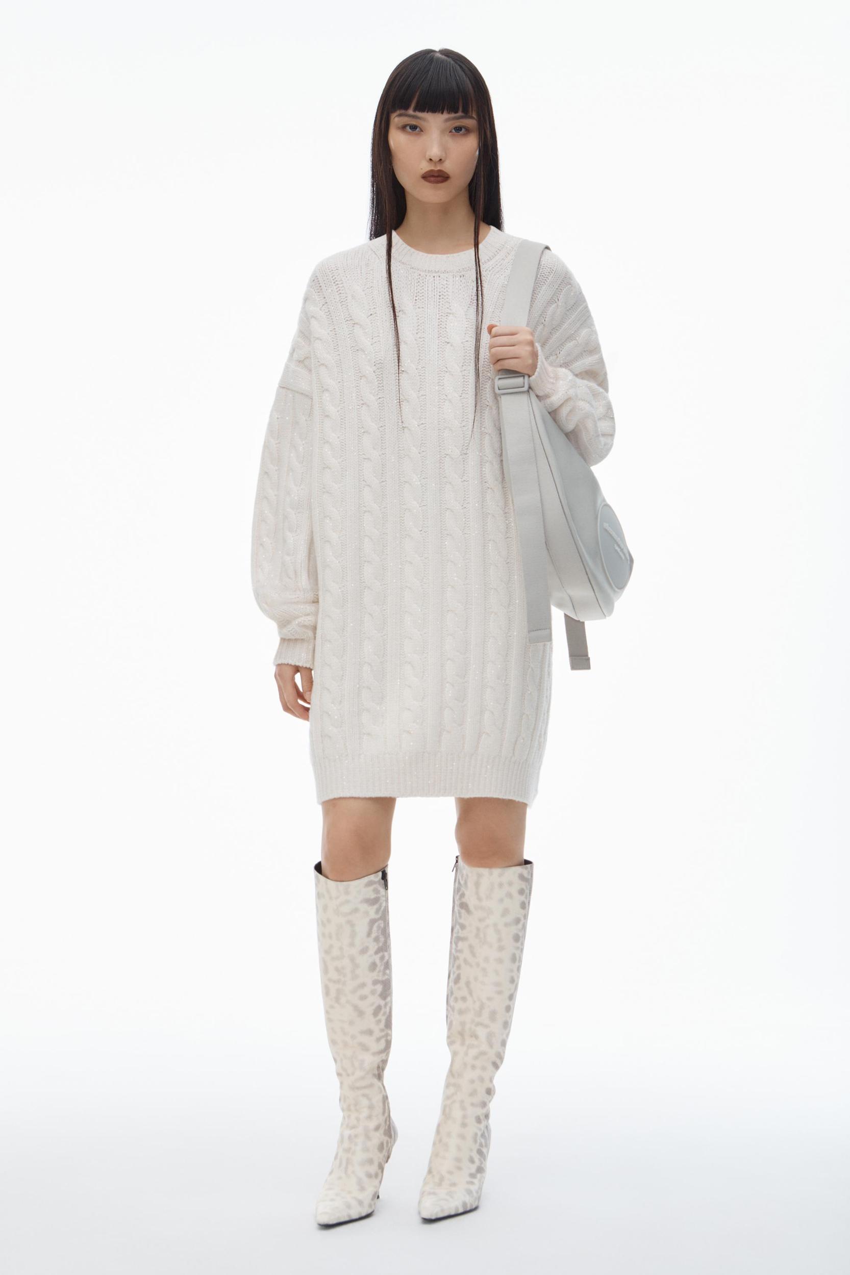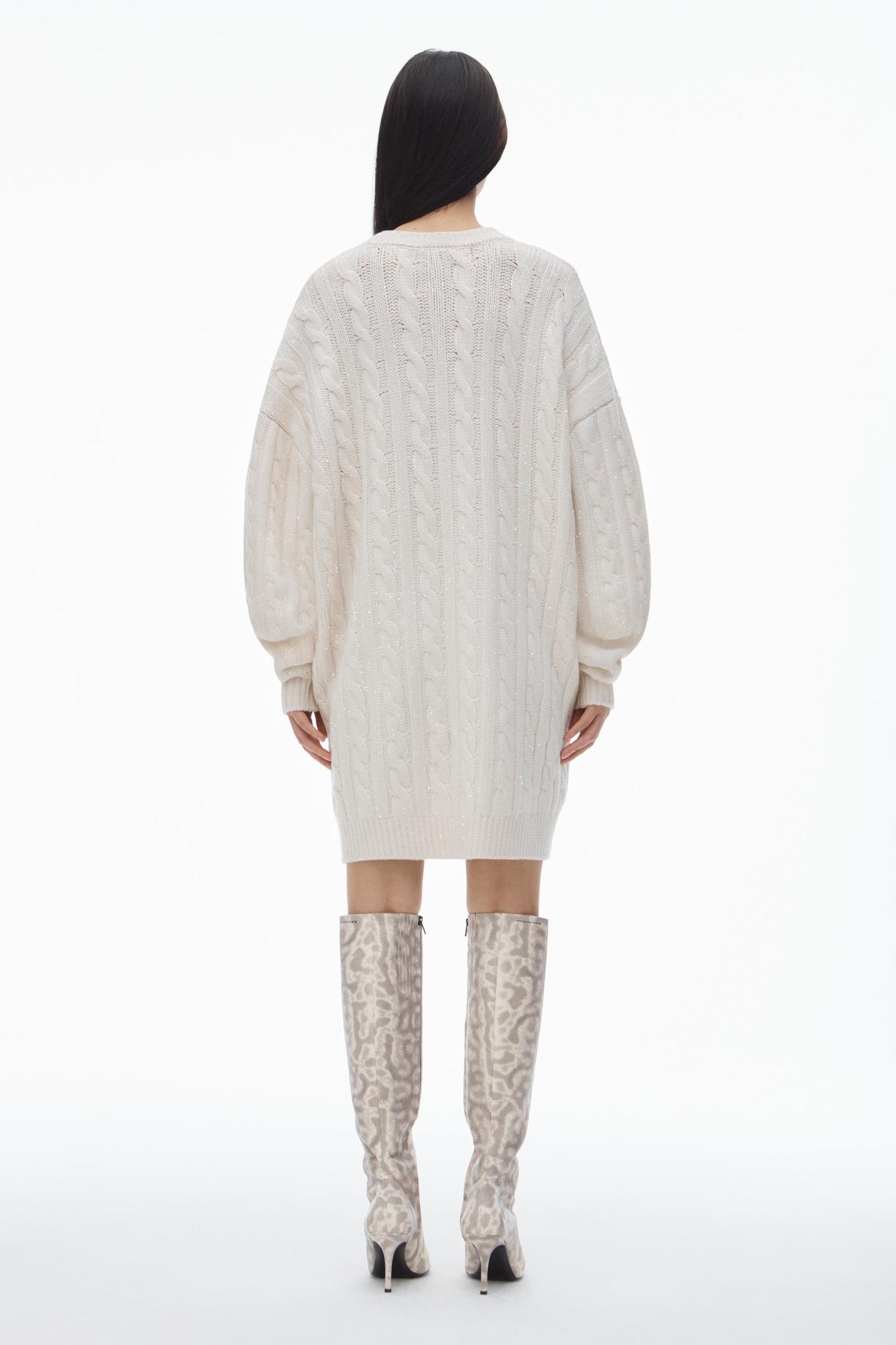 Clear bead hotfix lends a shimmering wet look to this ivory wool cable-knit dress featuring a relaxed, oversized fit.