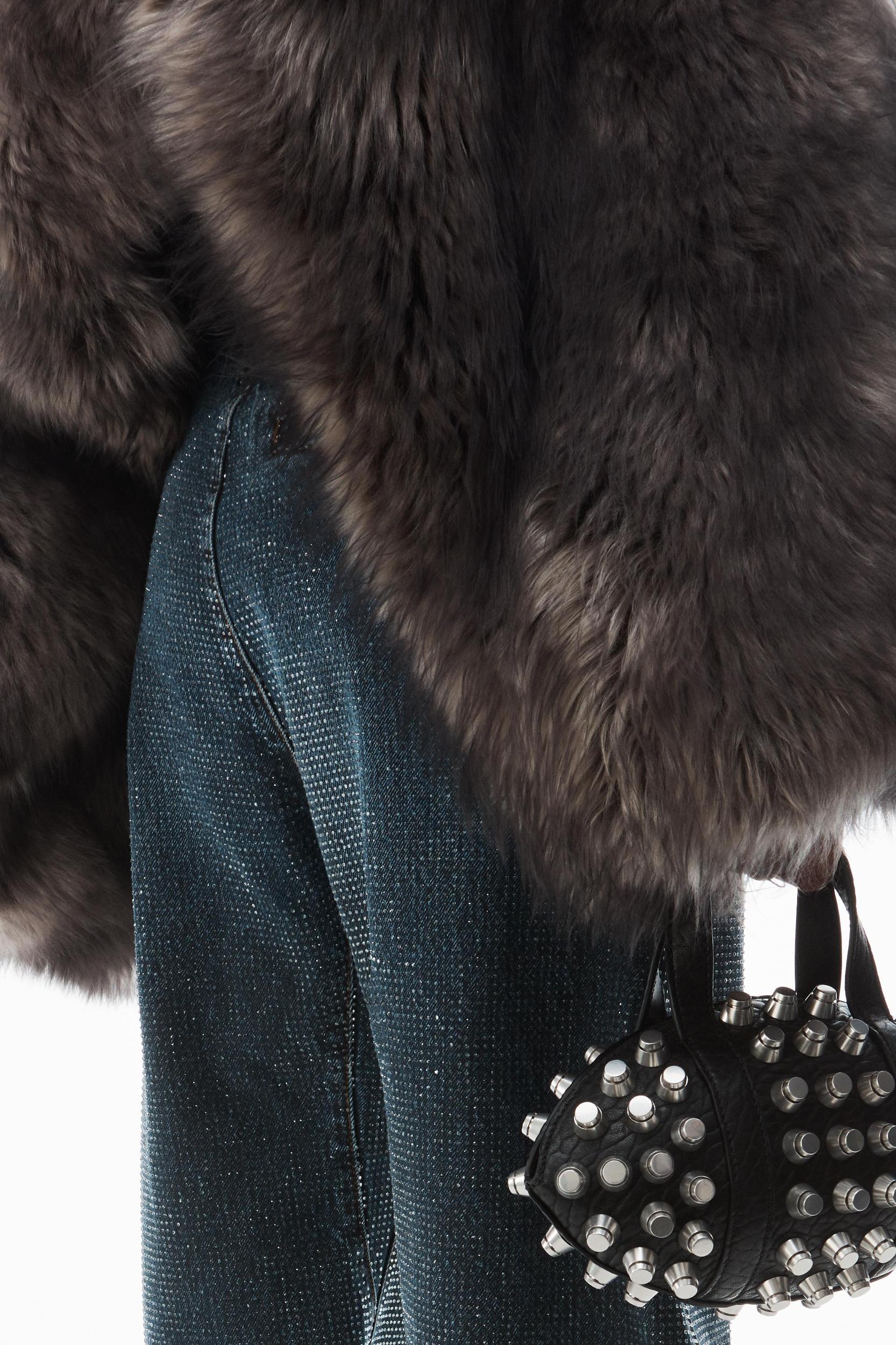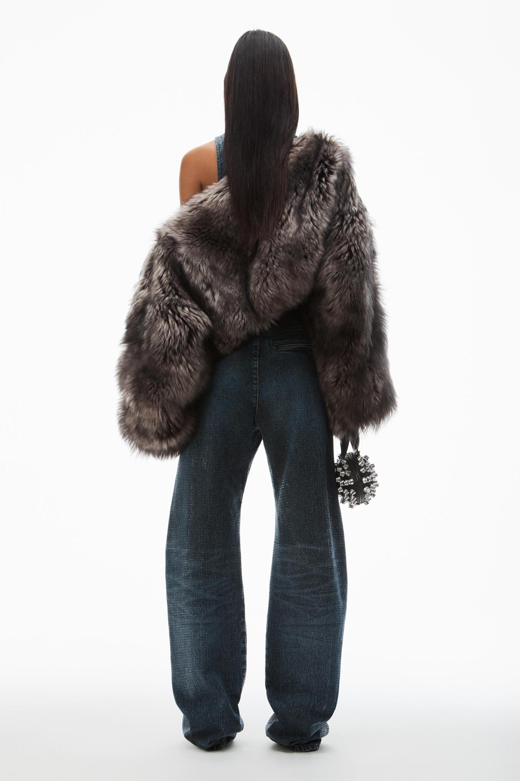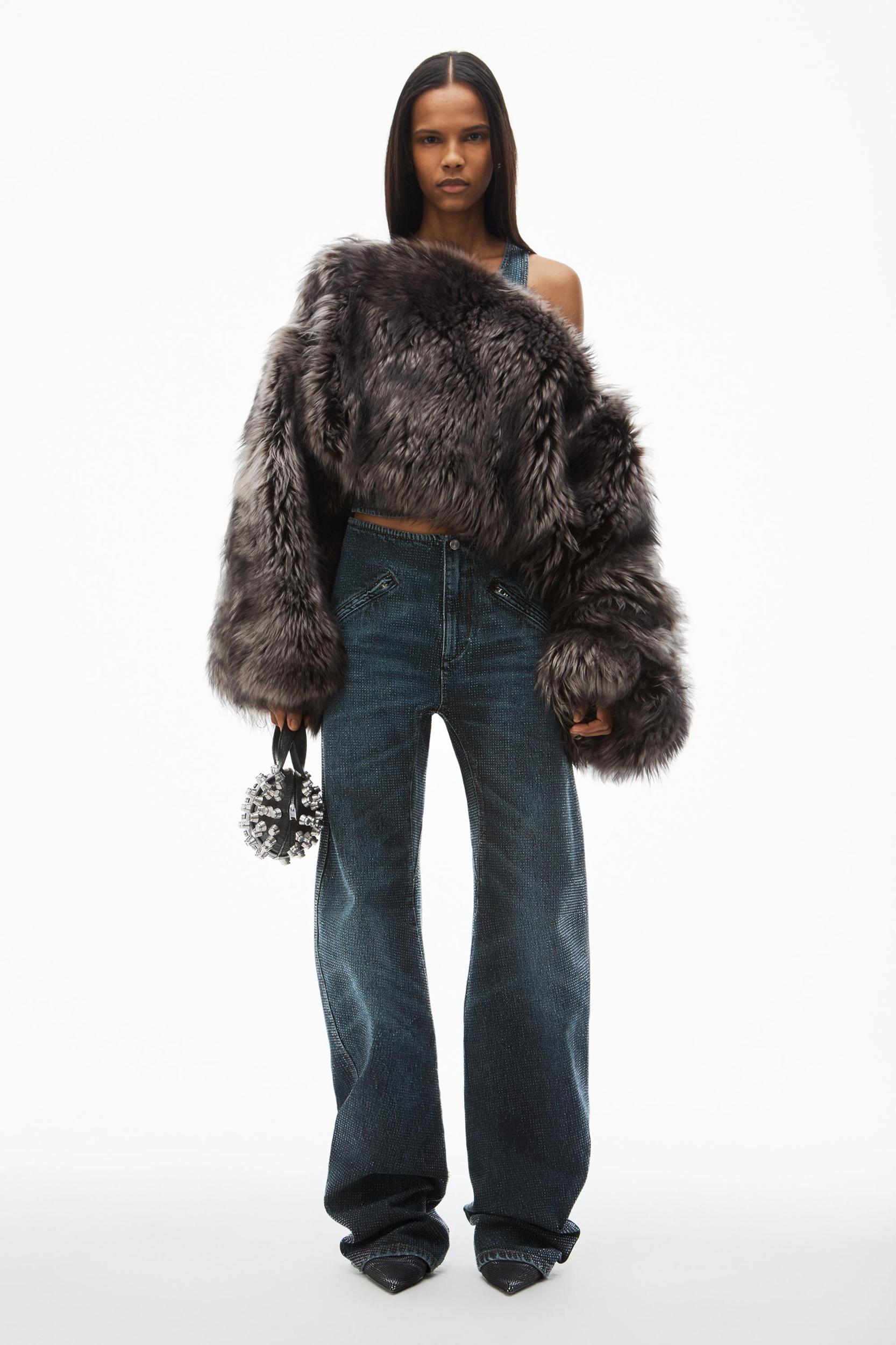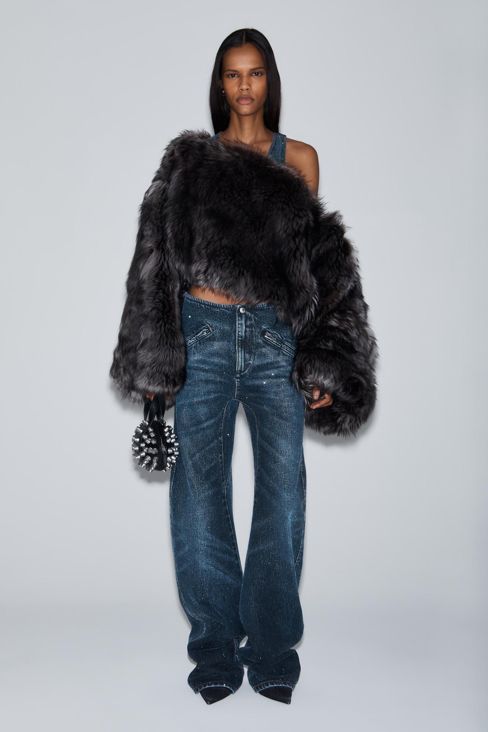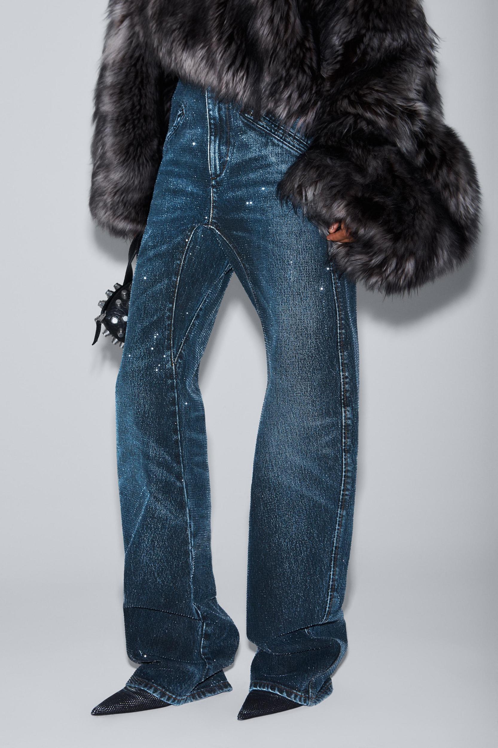 clear-bead hotfix animates this denim moto pant in a black crackle indigo wash. with twisted side seams resulting in a slightly rounded horseshoe silhouette, this elevated separate is detailed with slanted zip pockets and fastened by a zip fly and snap closure.