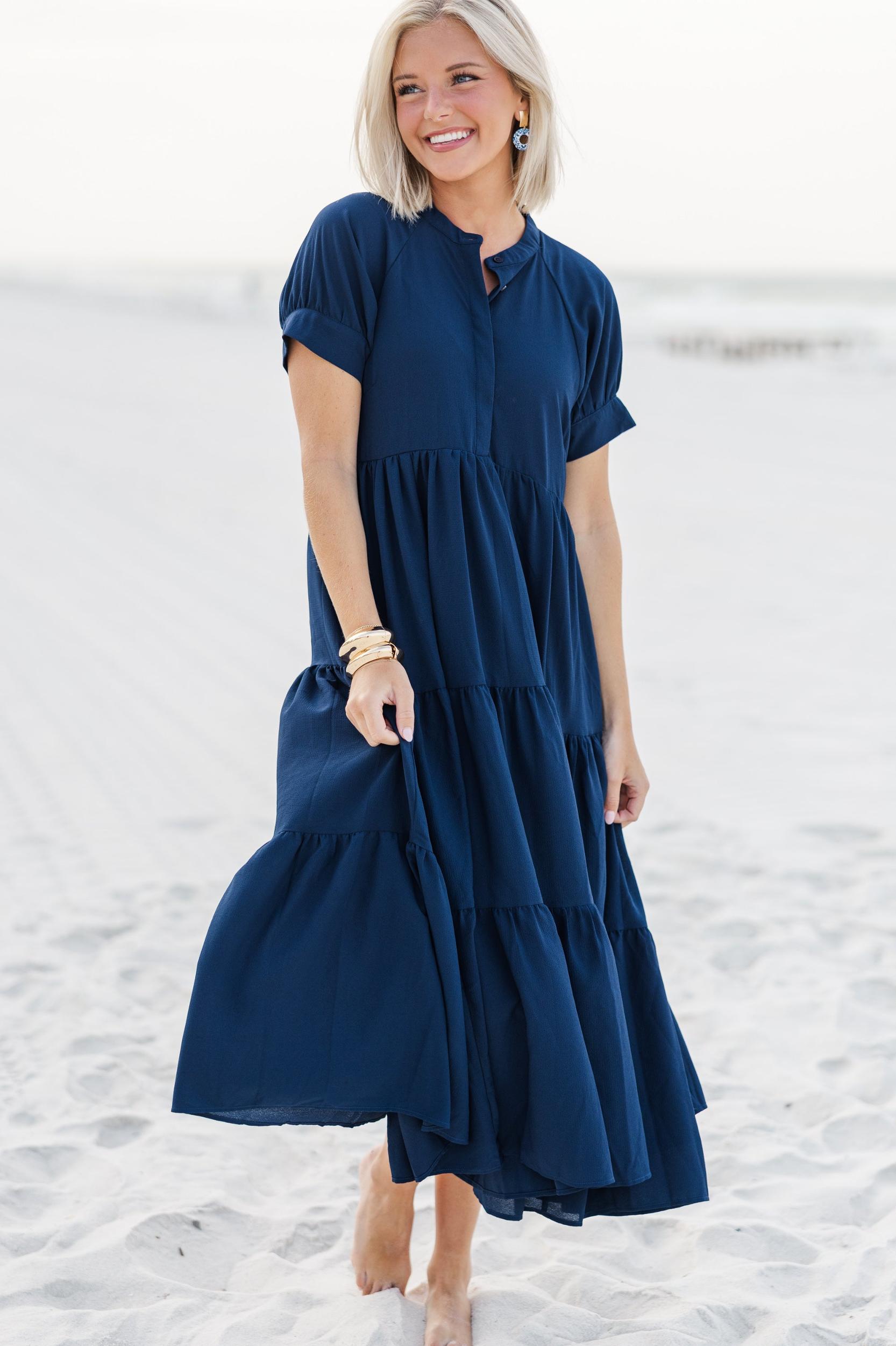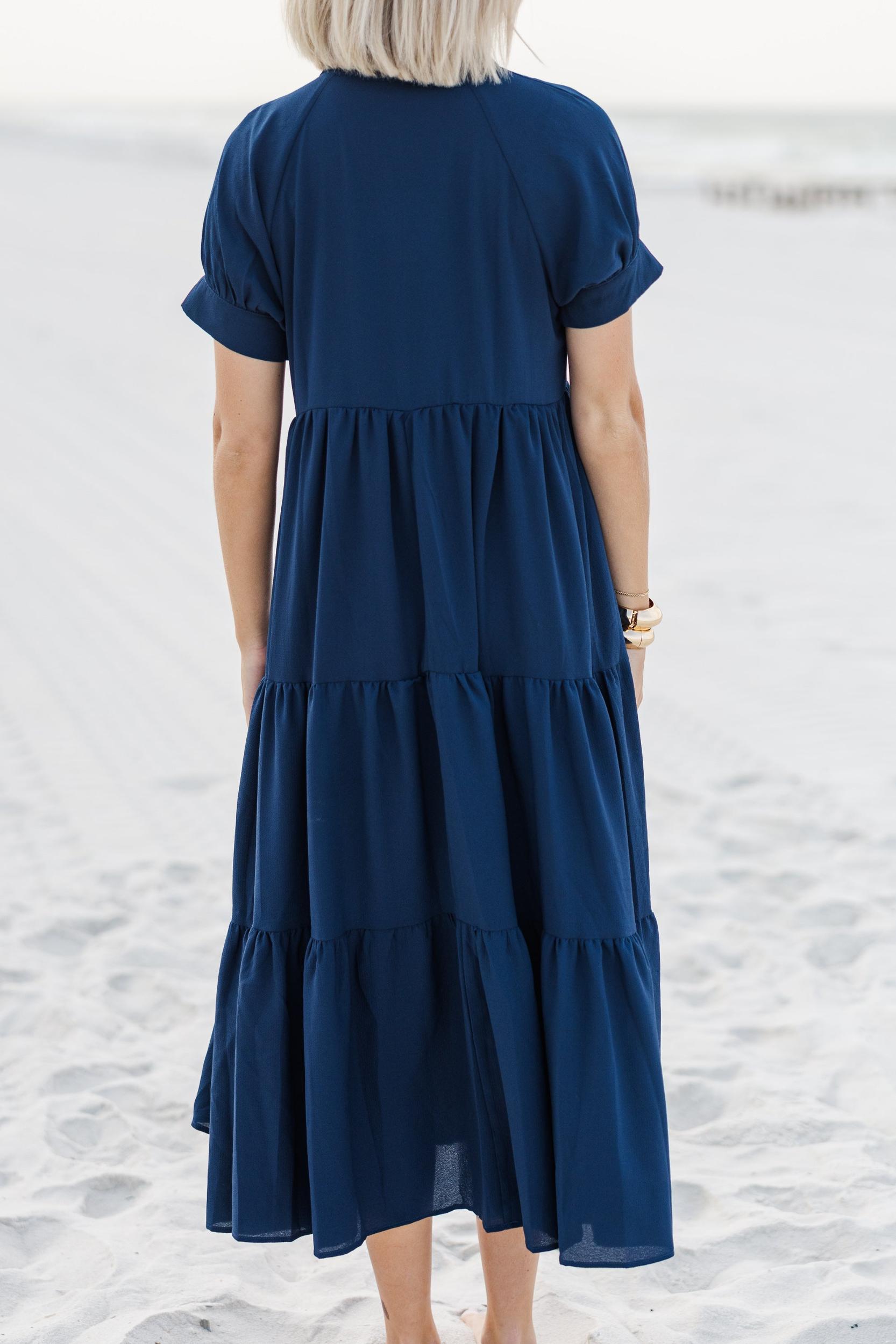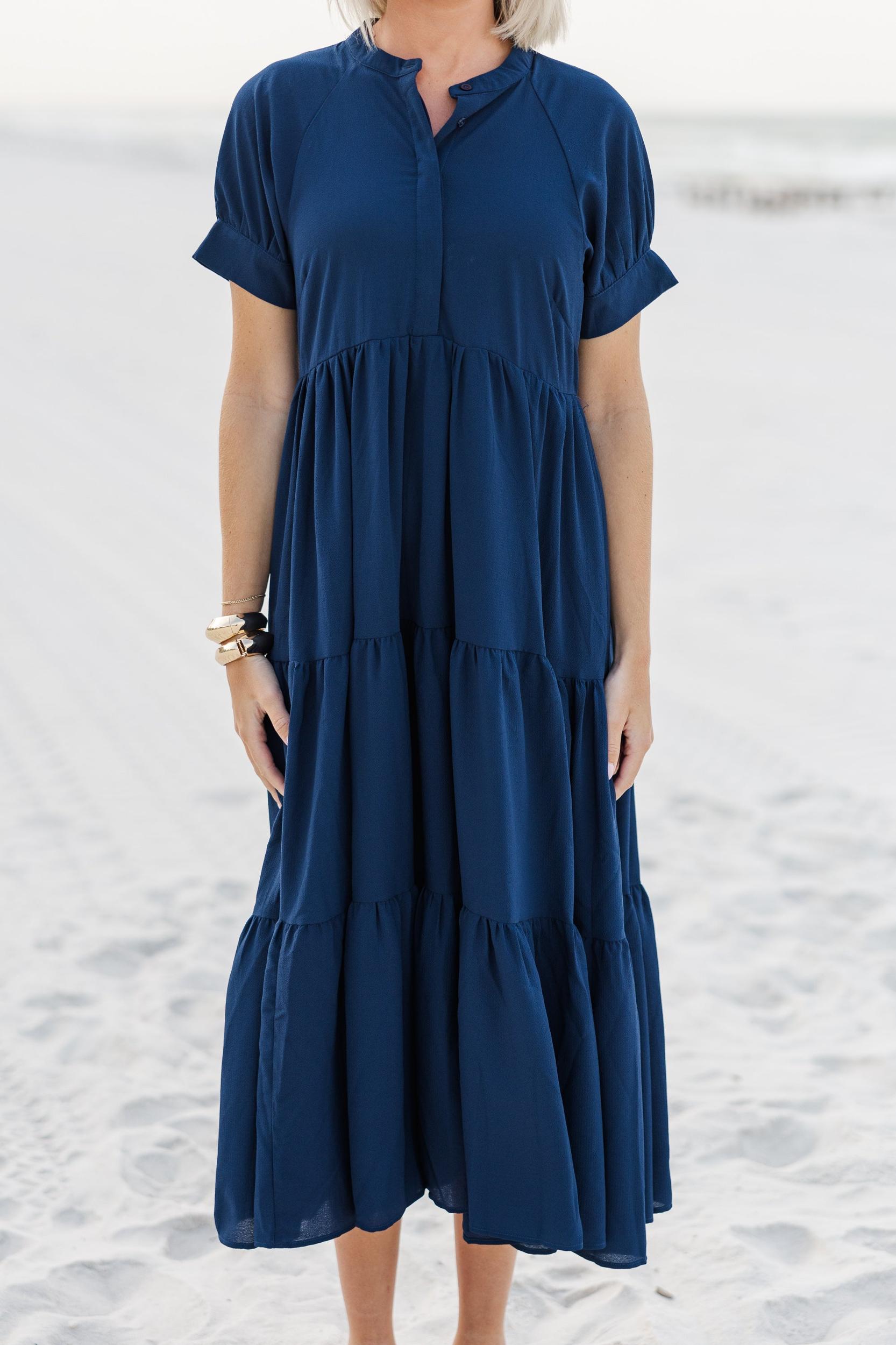 There are sure to be some clear skies ahead with this midi dress by your side! This tiered midi dress is so easy to dress up or down for so many different summer occasions! Partial button down round neckline Short sleeves Tiered body Material has no amount of stretch Payton is wearing the small.