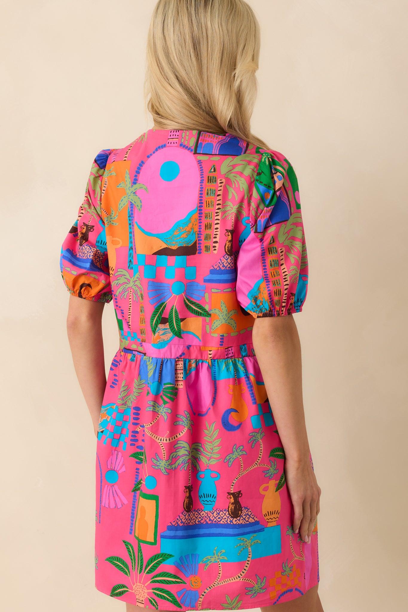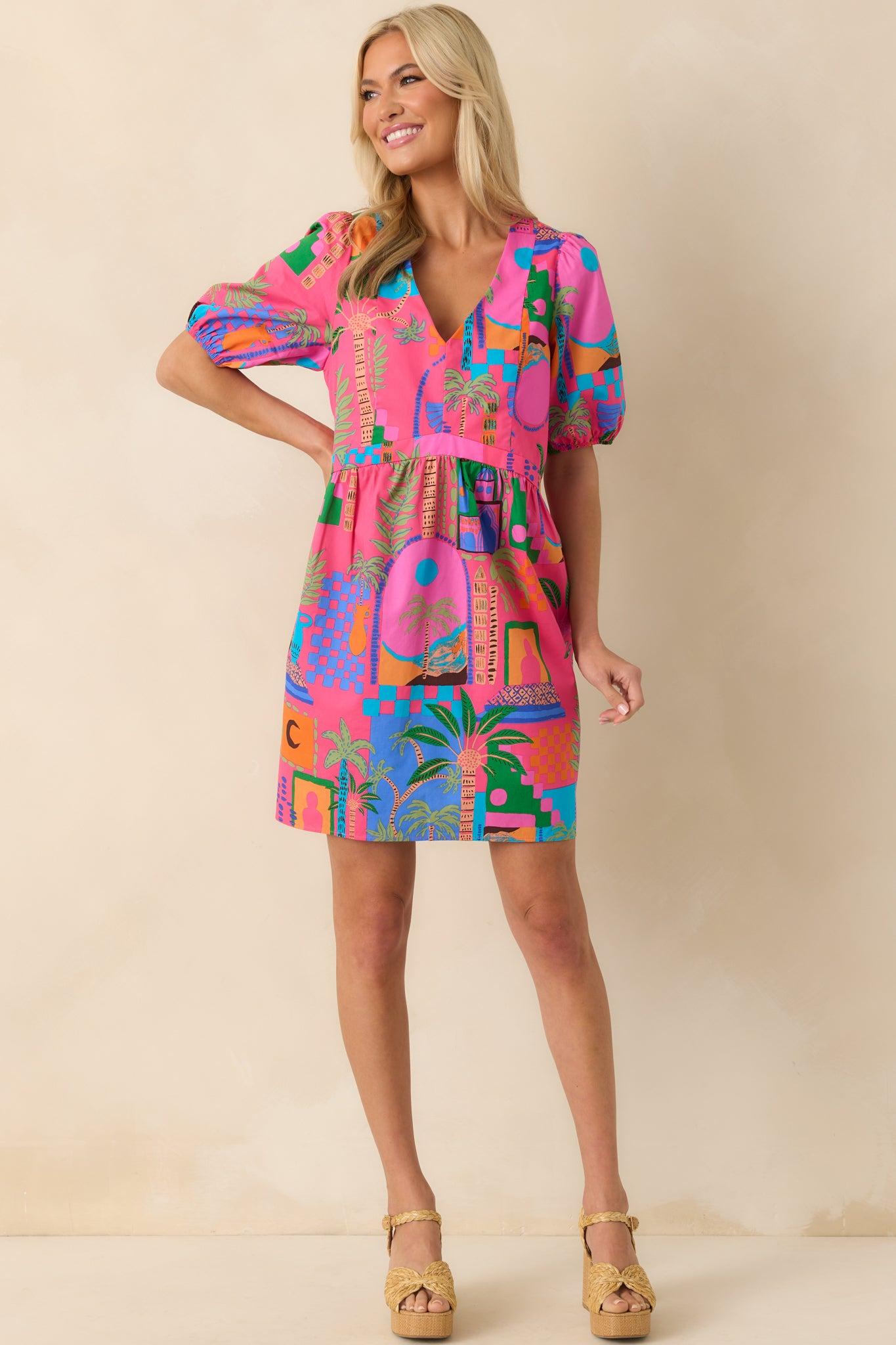Clear Skies Today Pink Tropical Print Cotton Mini Dress is all about light moods and easy moments. Bright and playful, it’s perfect for when the day feels wide open and everything’s looking up. This pink mini dress features a multicolor tropical print throughout, a v-neckline, short puff sleeves, elastic cuffs, and functional pockets.