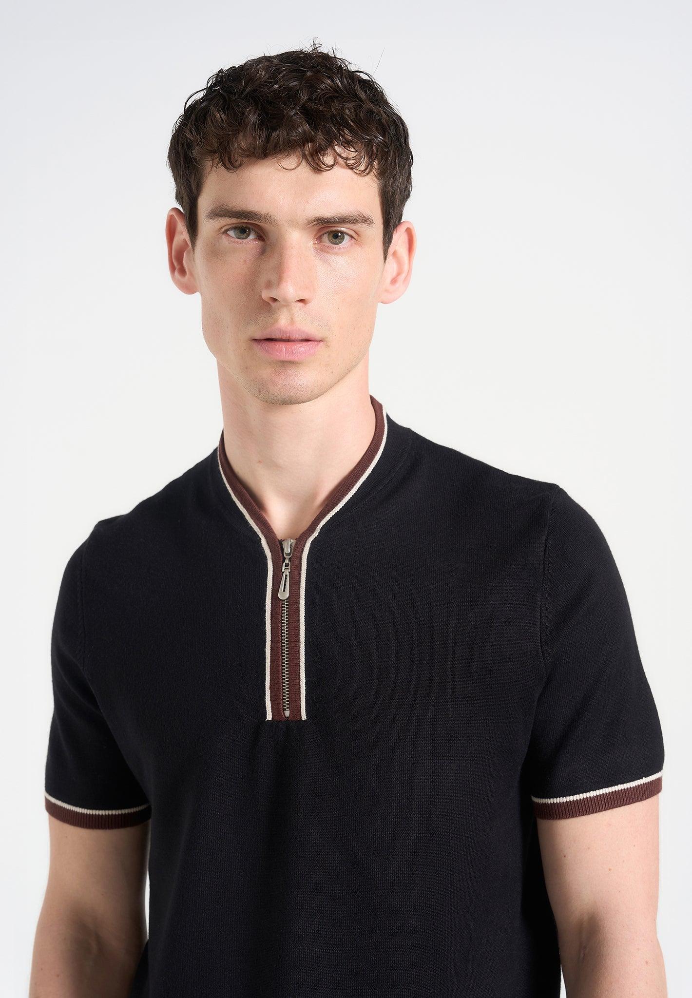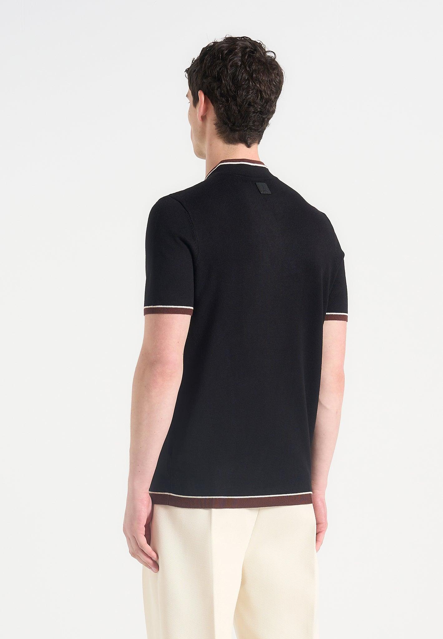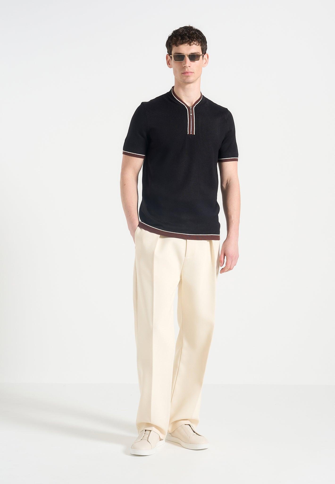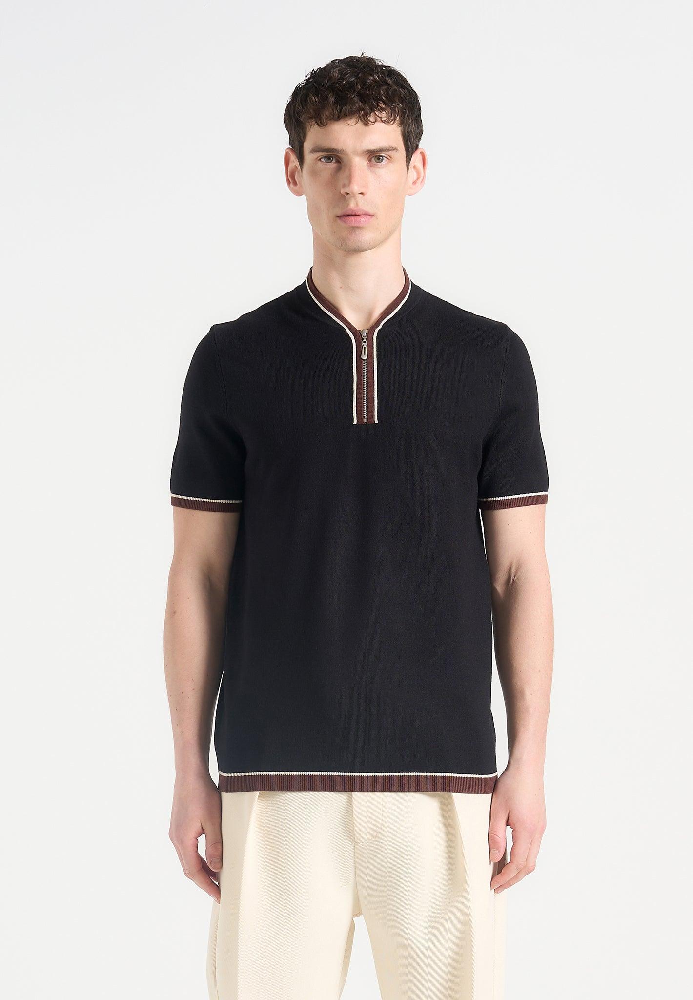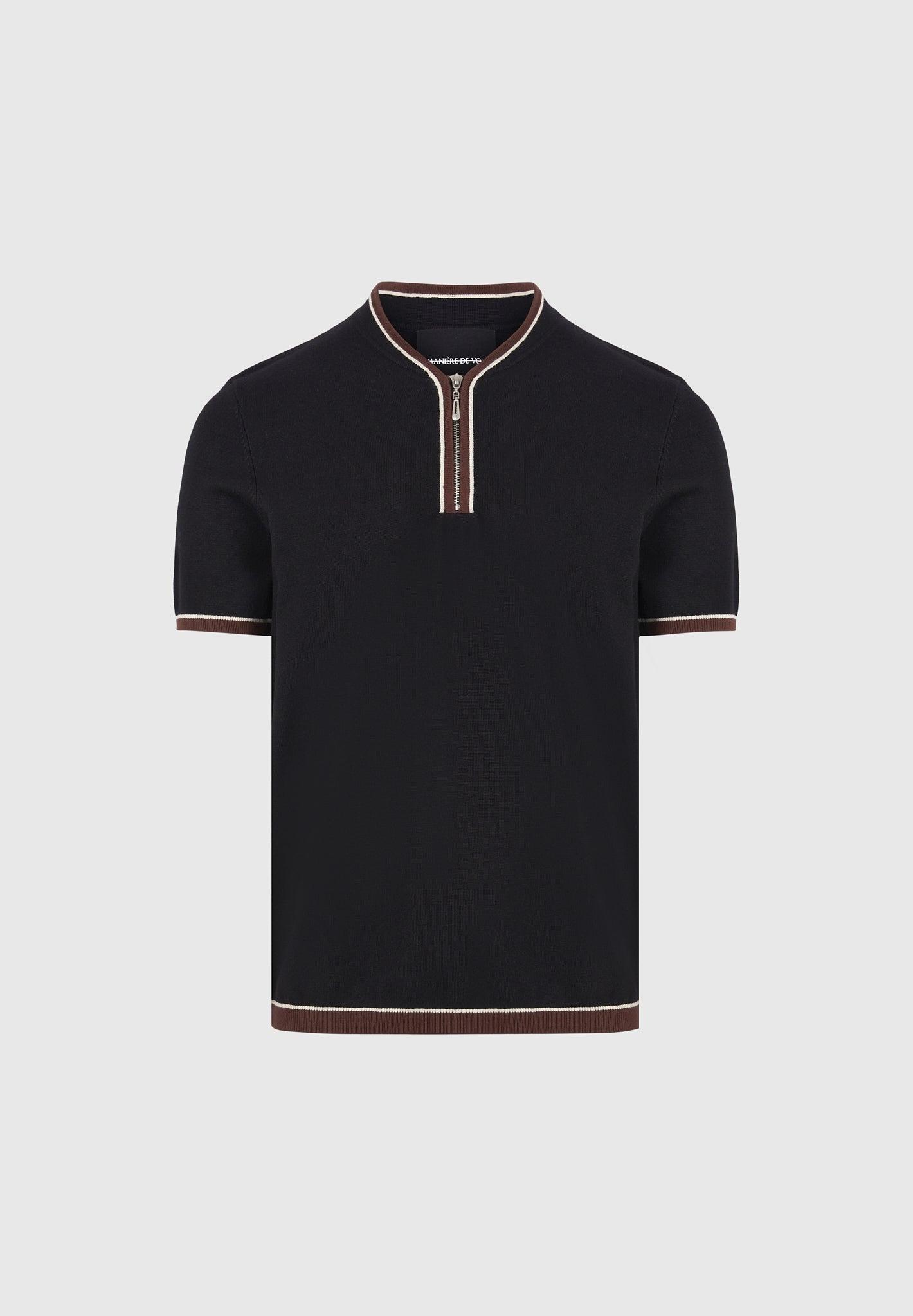 A hybrid of retro sport aesthetics and contemporary tailoring, the Crew Neck Zip Polo Shirt features a distinctive zip neckline framed by contrast taping for a bold vertical focal point. The refined crew collar offers a sleek alternative to traditional polo styling, while its tailored fit and ribbed finishes elevate the knit construction. Central Contrast Zip Placket for Linear Definition Crew Neckline for a Modern Twist on Polo Structure Compact Knit Fabrication with Form Retention Ribbed Hem and Sleeves for Sculpted Fit Tapered Cut for Clean, Athletic Drape Silver Manière De Voir Eiffel Plaque on Back 80% Viscose, 20% Nylon / 80% Viscose, 20% NylonAlways check the care label for wash instructions.