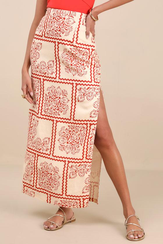 The lightweight, linen-blend fabrication of this skirt means you can still look effortlessly stylish even on the hottest summer days. A Boho-chic, stamp-inspired print sweeps across the figure-skimming maxi silhouette, while a high-rise waist and a convenient side slit complete the look. Hidden side zipper/clasp.