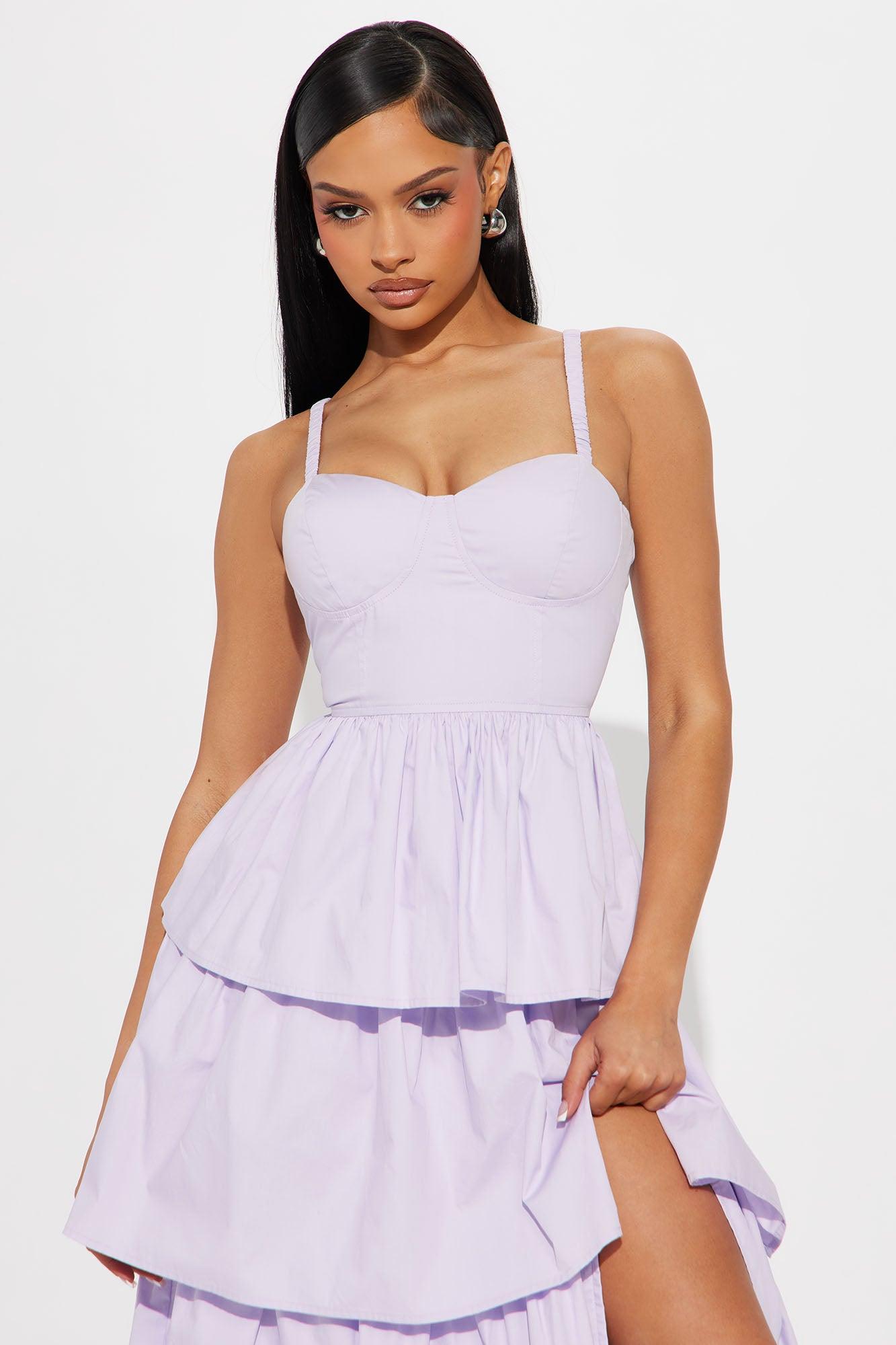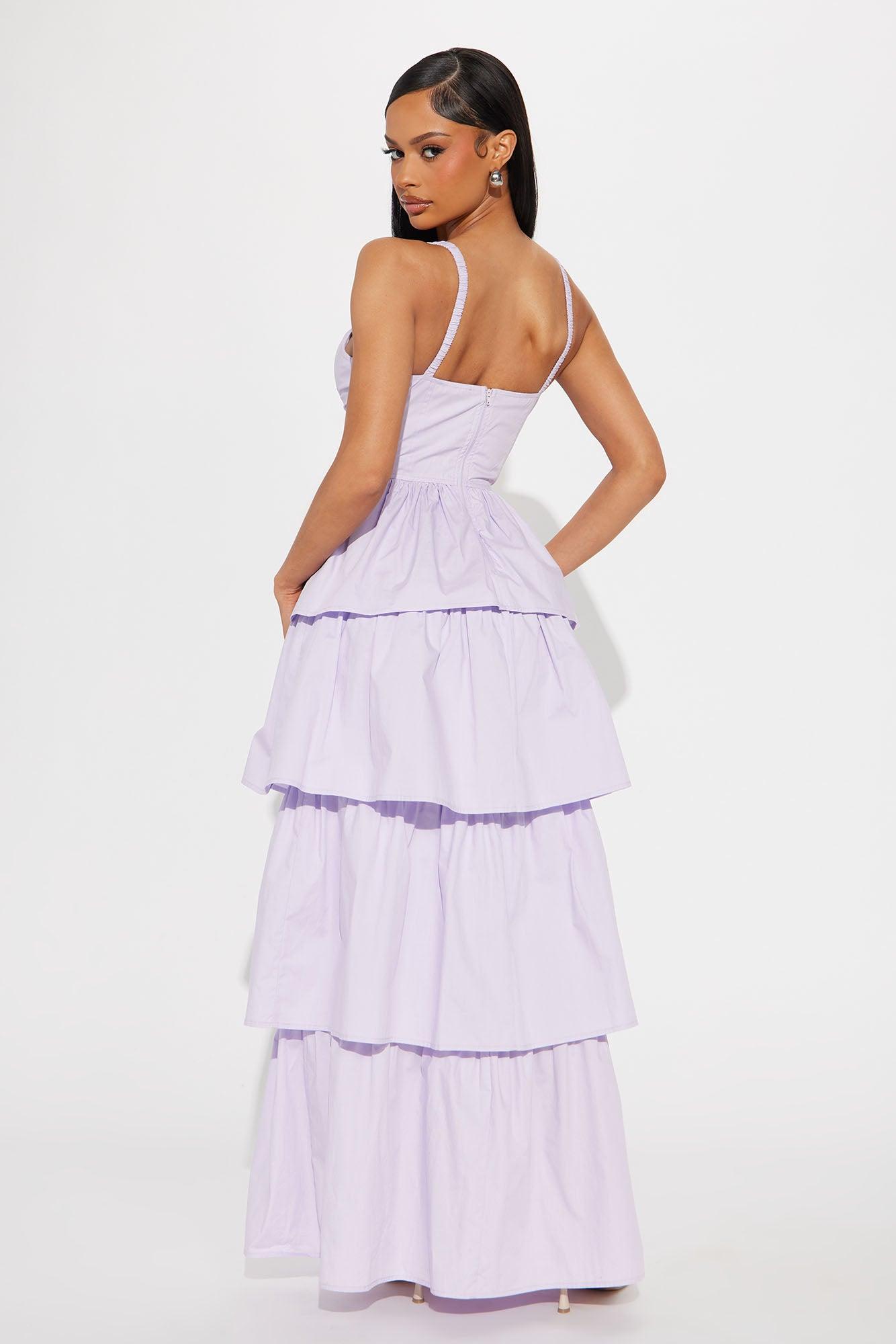 Available In Lavender And White. Poplin Maxi Dress Spaghetti Straps Scoop Neck Padded Bra Cups Ruffle Detail Pleated Tiered Back Zipper Closure Non Stretch Self: 100% Cotton Lining: 97% Polyester 3% Spandex Imported