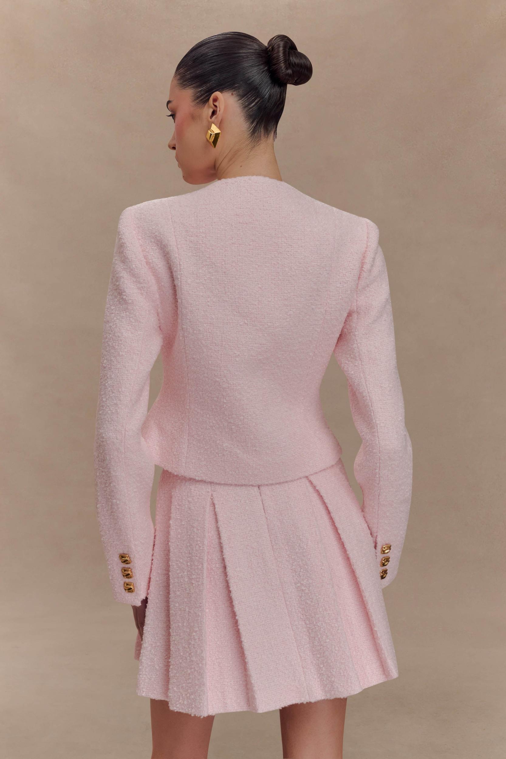 Effortless poise. Elevate your wardrobe with the CLEO Boucle Jacket, a timeless piece that blends classic tailoring with modern elegance. Featuring a refined round neckline and structured shoulder pads, this jacket creates a polished silhouette. The button-front closure and button sleeve details add a touch of sophistication, while non-functional pockets maintain a sleek and tailored appearance. Designed to pair perfectly with the Cleo Boucle Mini Skirt, this ensemble delivers effortless style that transitions seamlessly from daytime chic to evening glam.