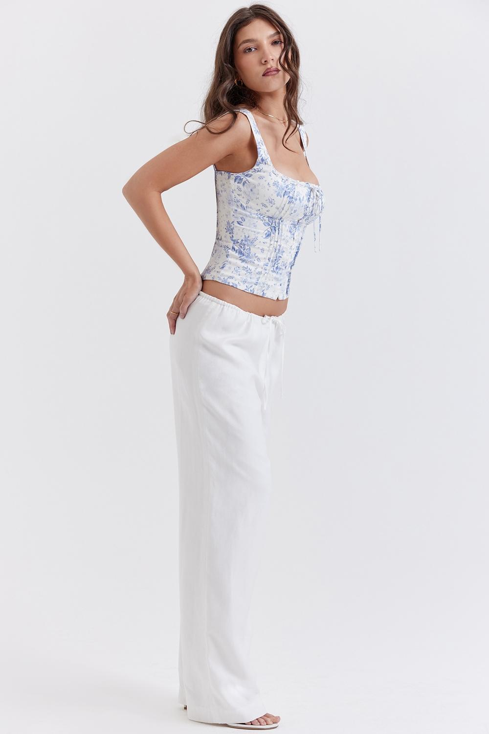 'Cleo' are the perfect Spring and Summer staple, cut from soft linen that will feel cool and fresh with breezy wide legs. The relaxed silhouette create a comfortable fit and they sit low-rise at the waist with a flexible waistband and drawstring ties. 'Cleo' are fully lined and we love them styled with our 'Chicca' top in blue floral and delicate heels for pretty lunch dates.