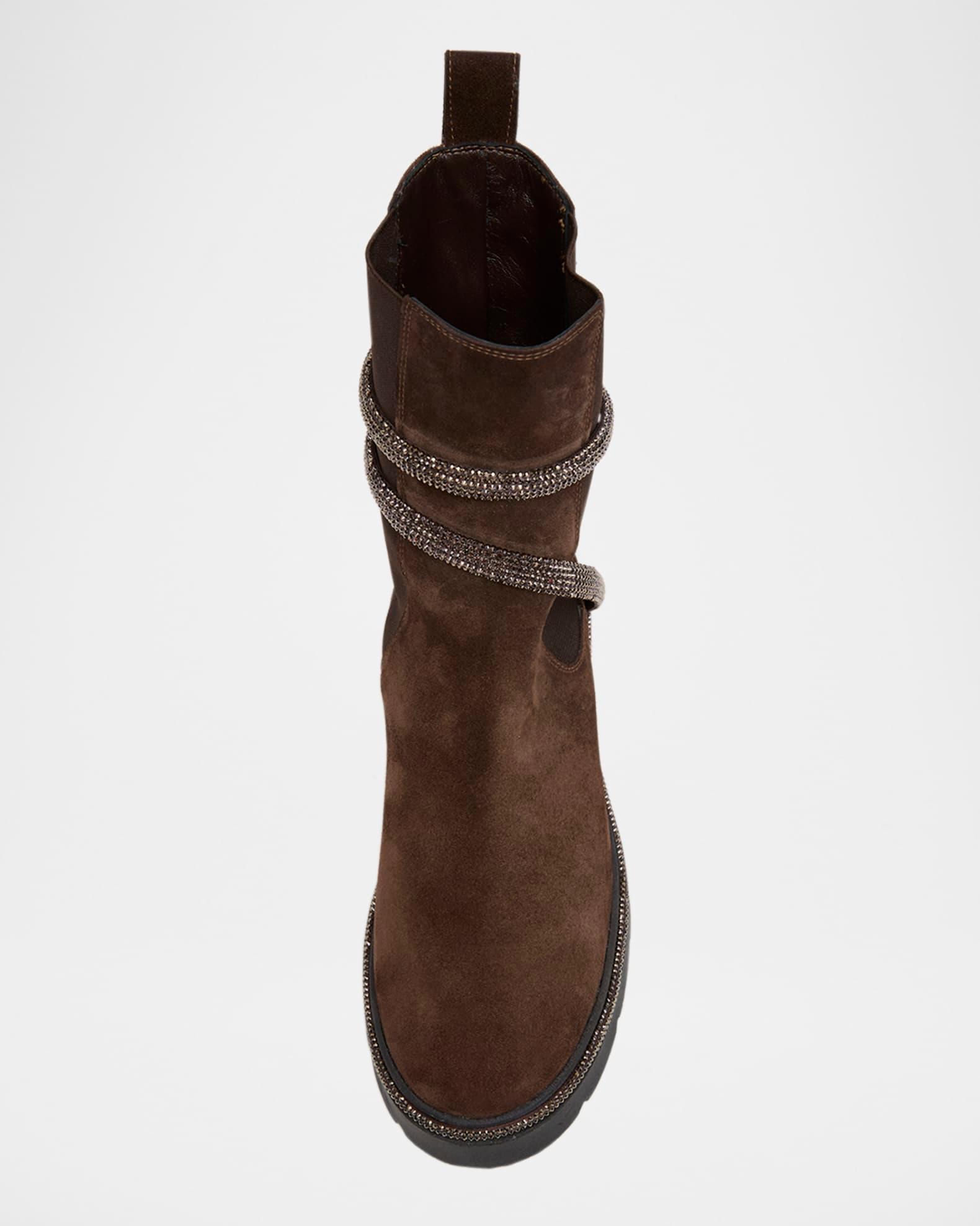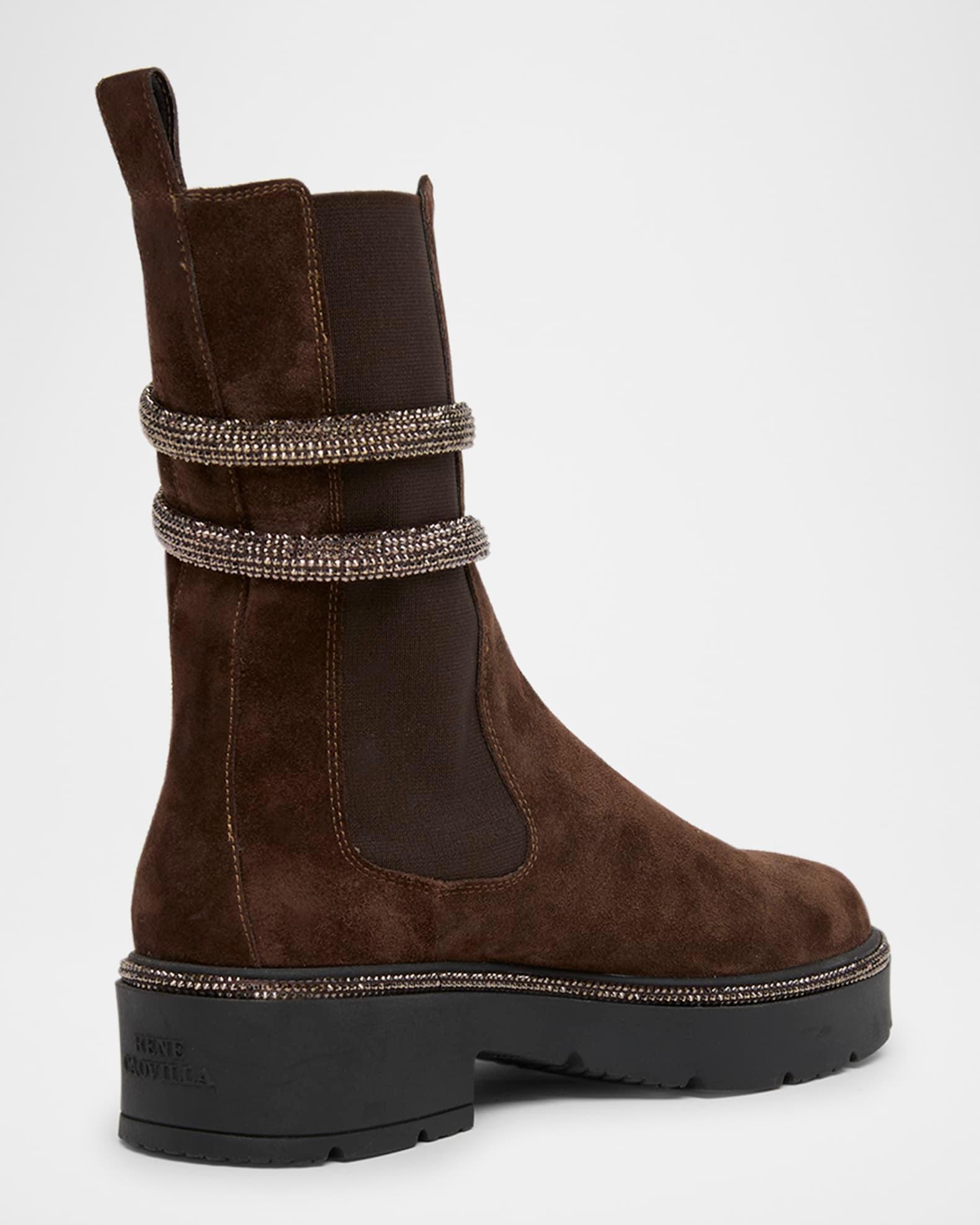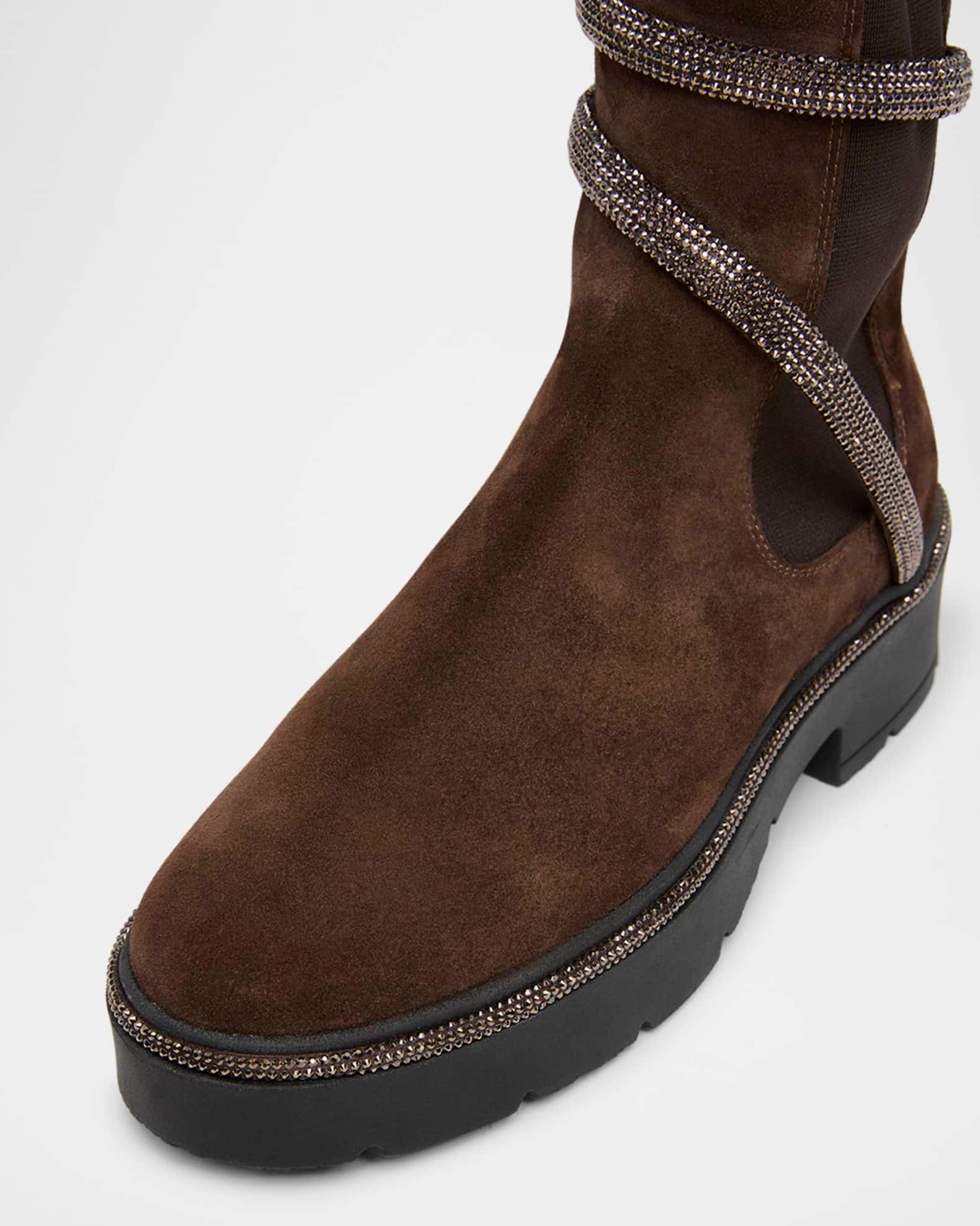 Rene Caovilla "Cleo" combat boots in supple calf suede with a crystal-embellished wraparound snake accent Chunky heel Round toe Elastic gored sides Pull-tab at backstay Pull-on style Midsole inset with crystal embellishments Leather trim Made in Italy