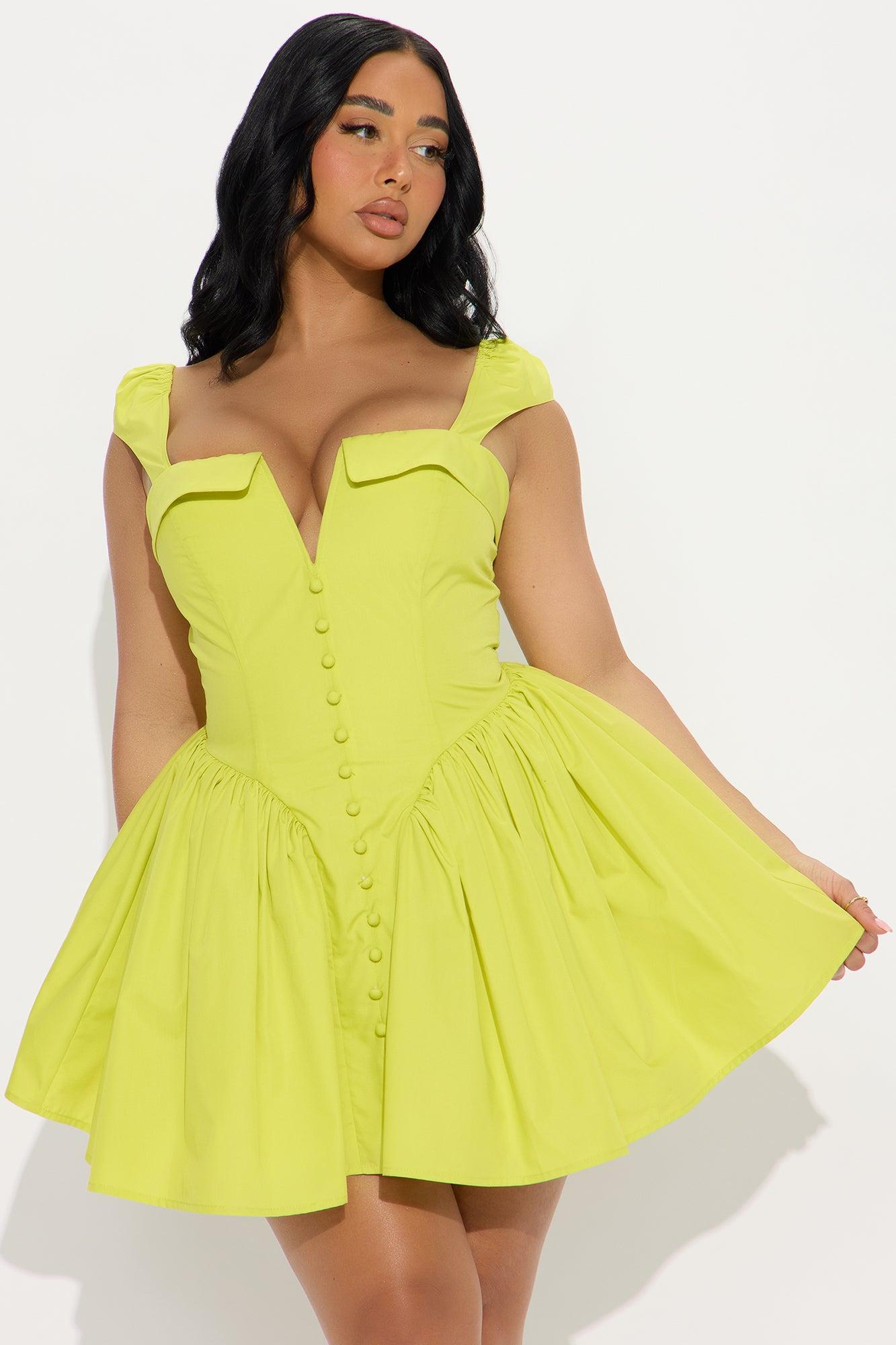 Available In Chartreuse And Black. Poplin Micro Mini Dress Notch neckline w/ v-wire Short cap sleeves Fold over detail Faux button up Ruched Back zipper Lined Slight stretch Length measured flat = 30" Self : 75% Polyester , 25% Cotton Lining : 100% Polyester Imported