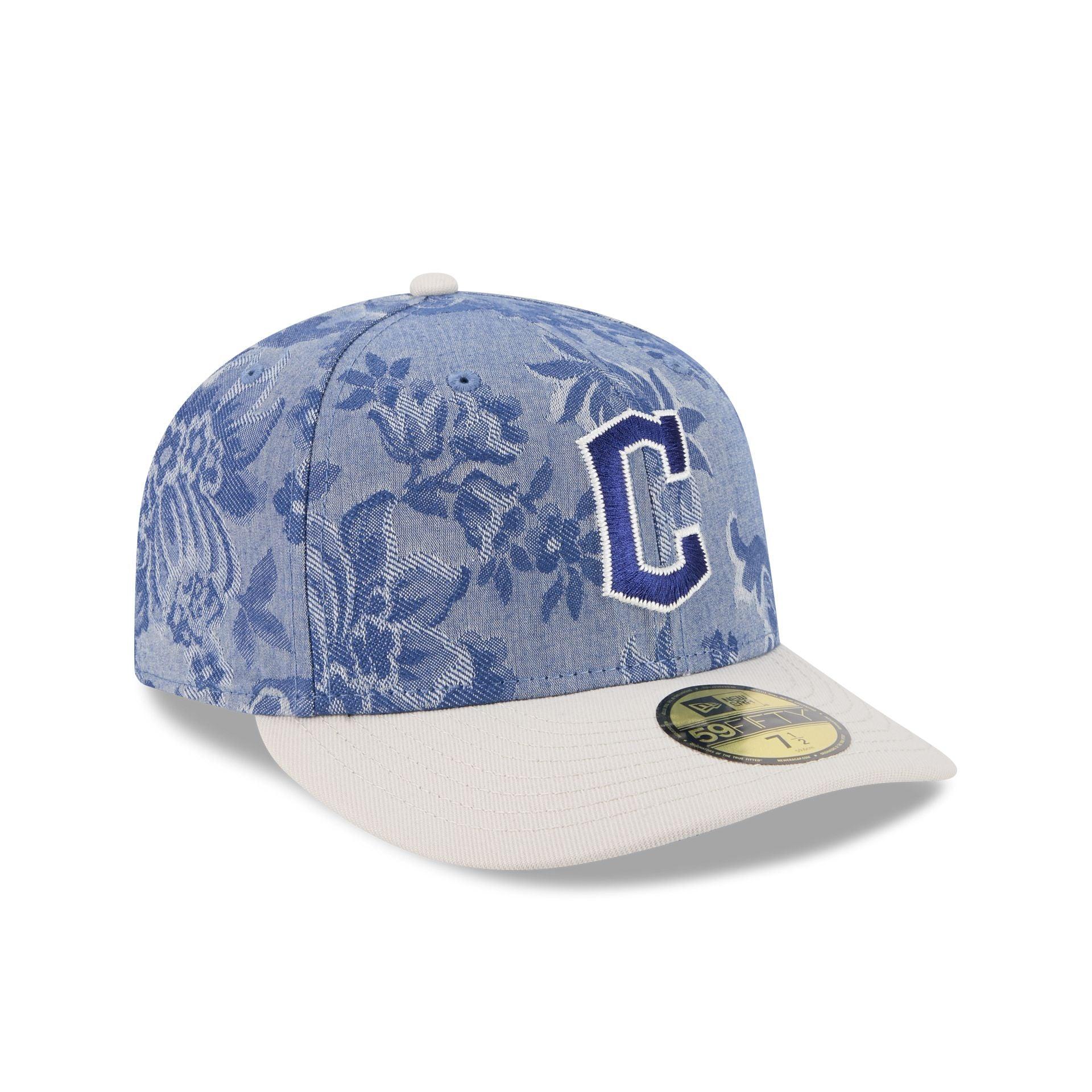 The Cleveland Guardians Two-Tone Denim 59FIFTY Fitted Cap features an embroidered Guardians logo at the front panels against a specialty Japanese milled gobline chambray fabrication from Three Looms Japan Fabrics throughout the cap. Additional details include an MLB Batterman logo at the rear and a gray undervisor.