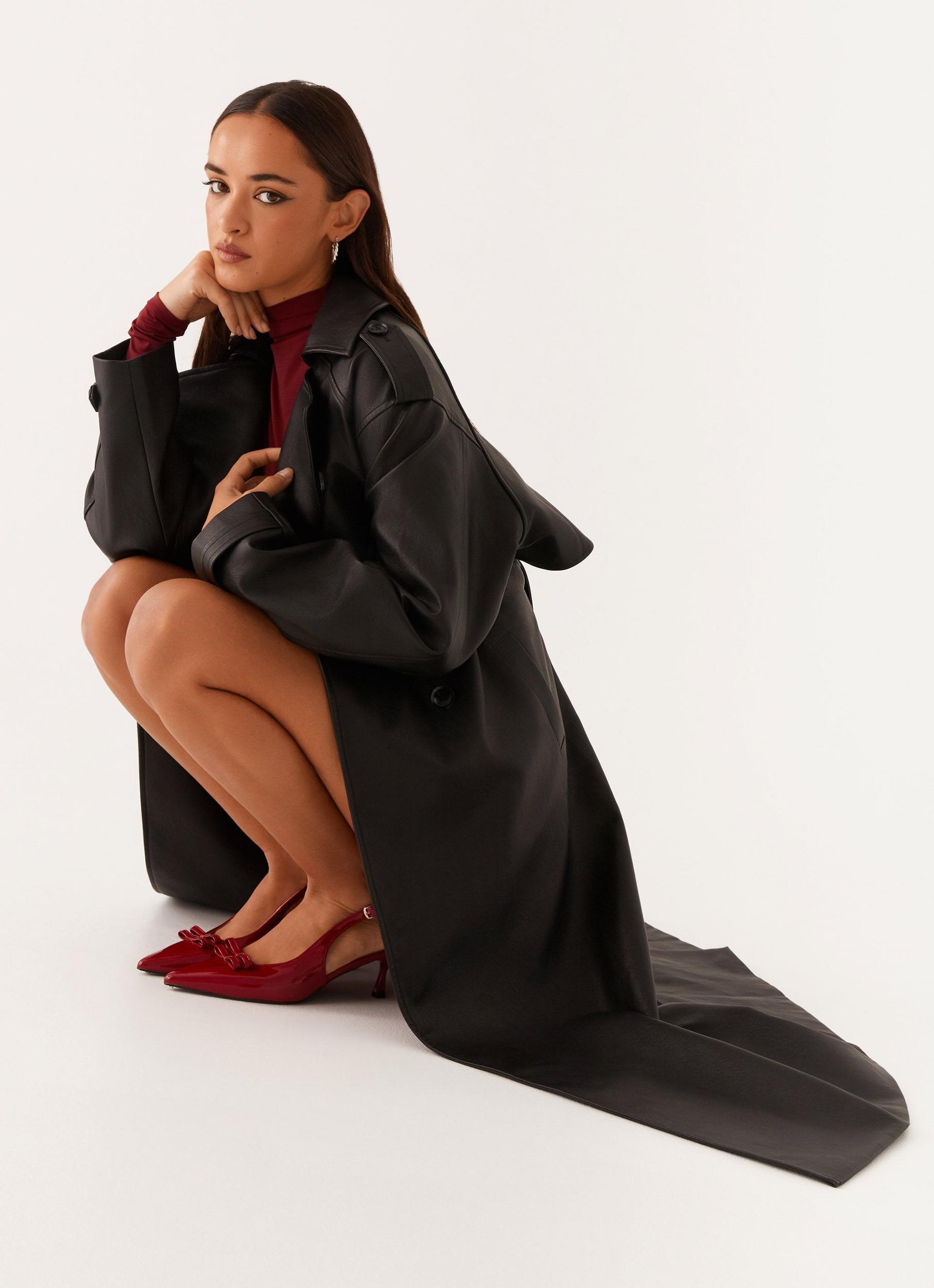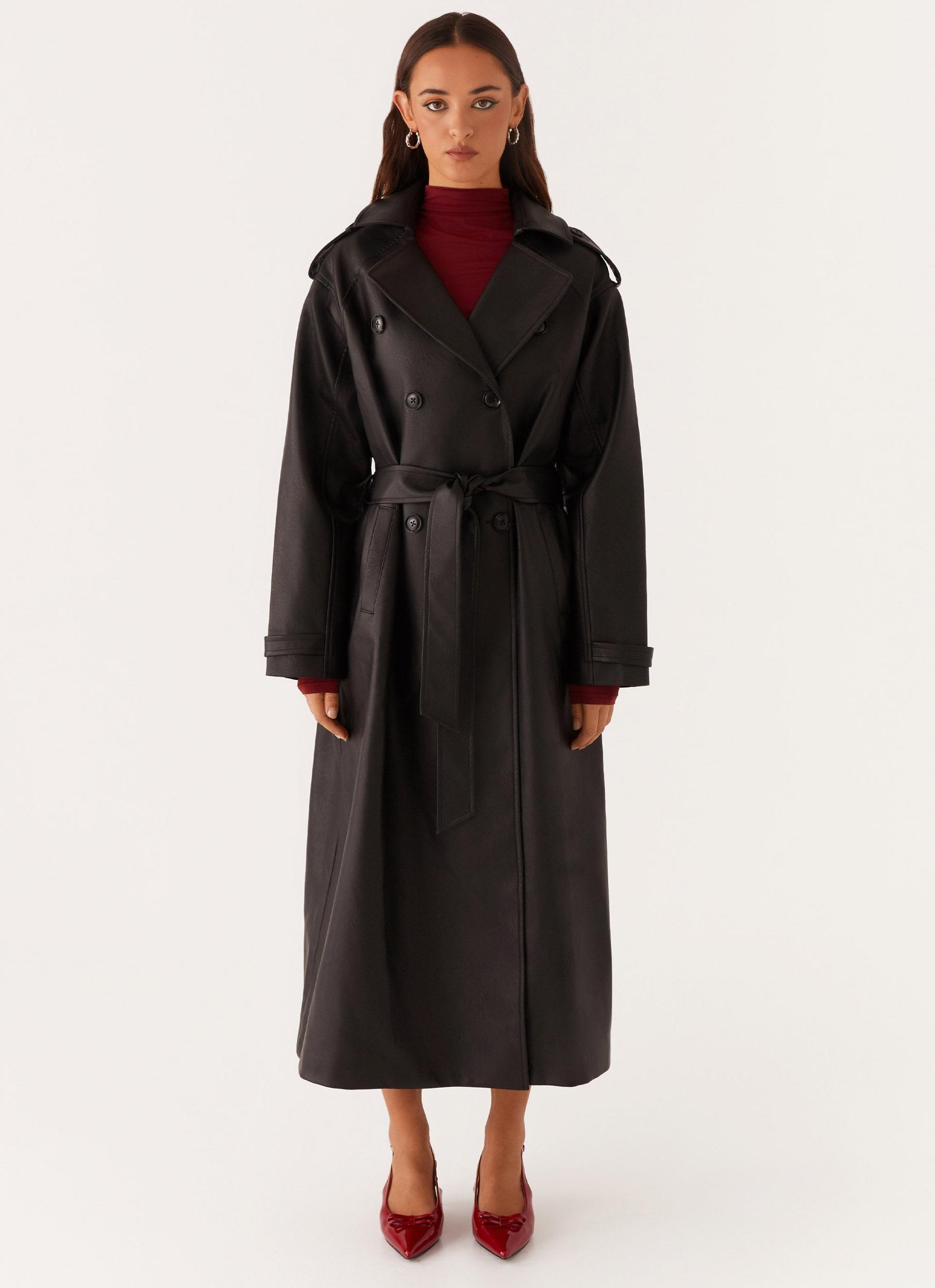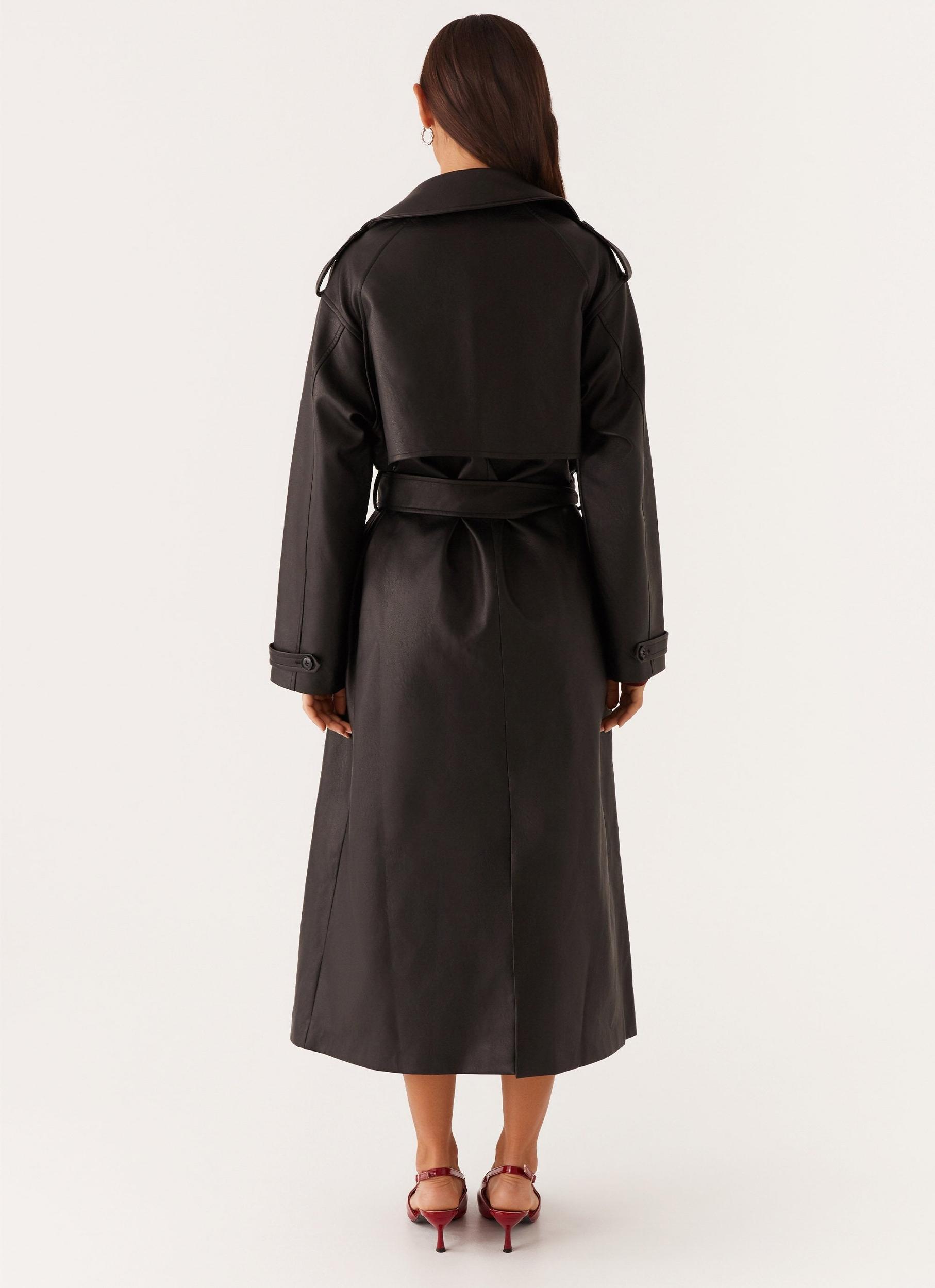 Peppermayo Exclusive The Cleveland Trench Coat exudes timeless elegance with its V neckline and double collared design. Fully lined for comfort, this coat effortlessly combines style and practicality, making it a staple for any wardrobe. Perfect for layering over your favorite outfits, it adds a sophisticated touch to your look while keeping you cozy. - Maxi length- V neckline- Double collared neckline- Fully lined- Belt and belt loops around waist- Front buttons- Front twin single welt pockets- Fabric: 100% PU; Lining: 100% Polyester Size AU 8 / US 4 garment measurements: Bust: 128 cm / 50.39 inHem: 160 cm / 62.99 inSleeve length: 58 cm / 22.83 inLength: 130 cm / 51.18 in Roberta is 177cm and wears size AU 6 / size US 2