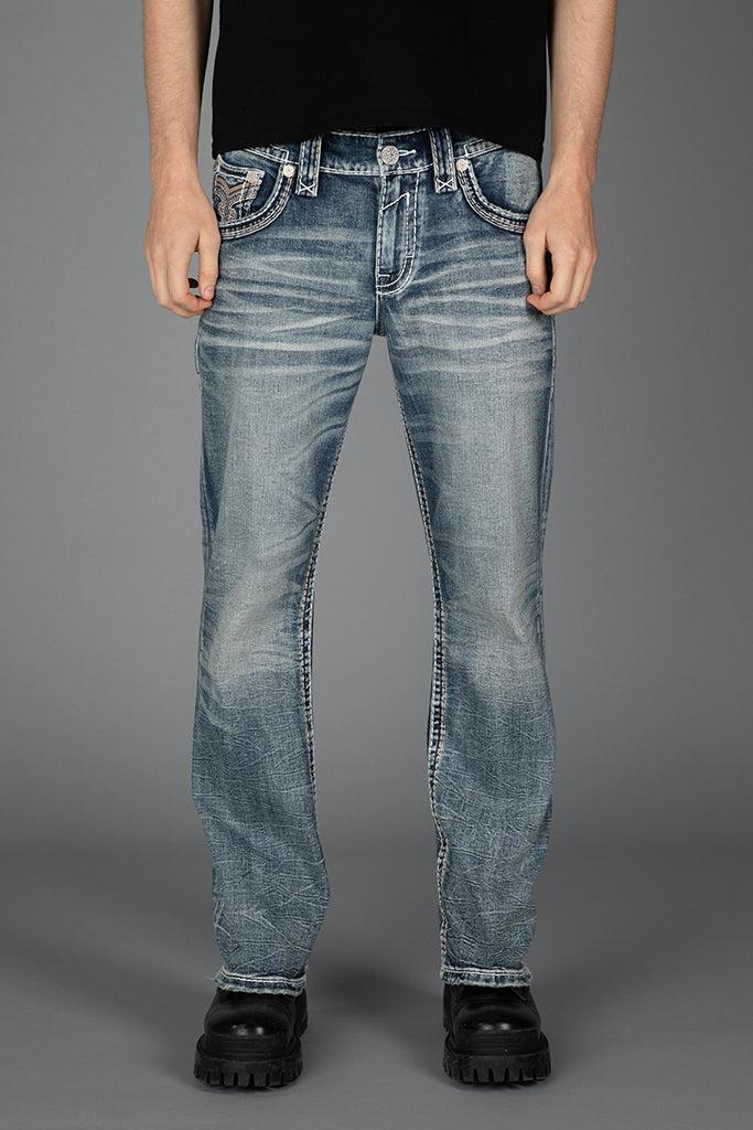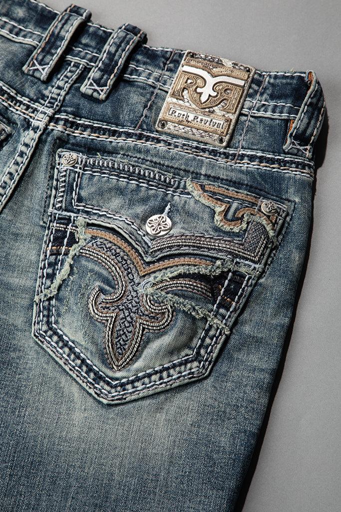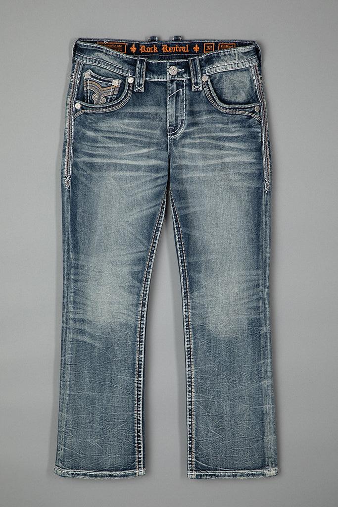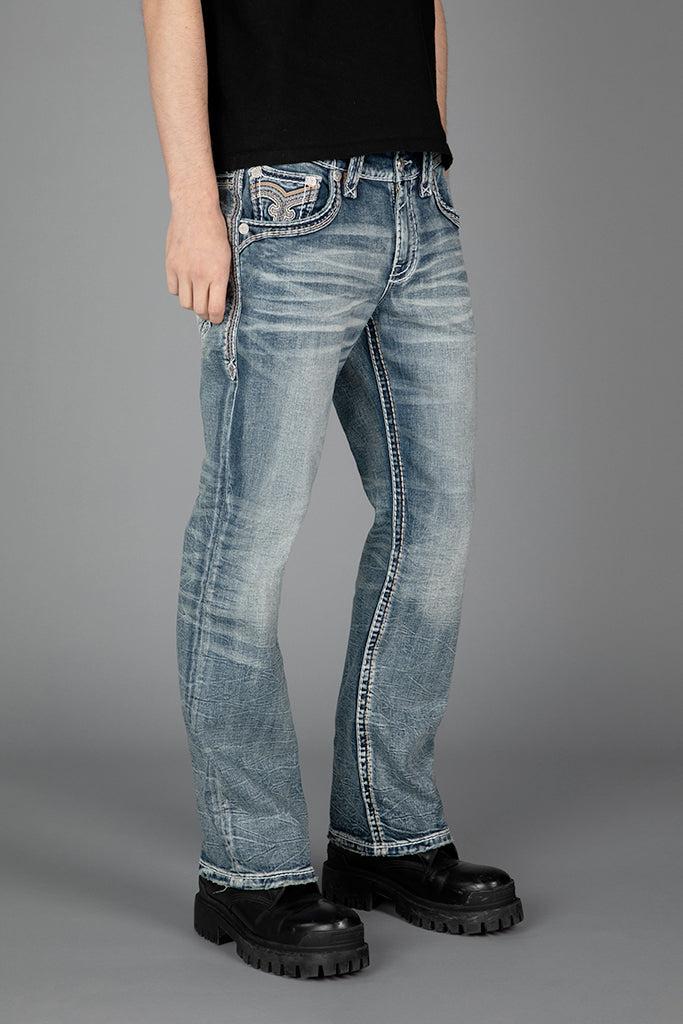 Timeless in form. The Clifford Bootcut Jeans redefine men’s premium bootcut denim with quiet confidence. Crafted from premium stretch denim, this classic bootcut fit offers versatility and all-day wearability. The silhouette remains sharp yet fluid, engineered for movement without compromise. Intricate stitching and subtle distressing add depth without excess, while the iconic inverted Fleur-de-Lis back pockets reinforce Rock Revival’s signature craftsmanship. Finished with custom pewter buttons and rivets, along with a metal-engraved “Rock Revival” leather patch. Built for longevity. A statement. A standard. Details: Men’s bootcut jeans, structured through the thigh with a subtle flare Premium stretch denim, engineered for movement Signature inverted Fleur-de-Lis embroidery, a quiet insignia Custom pewter buttons and rivets Metal-engraved “Rock Revival” patch Designed in Los Angeles, California
