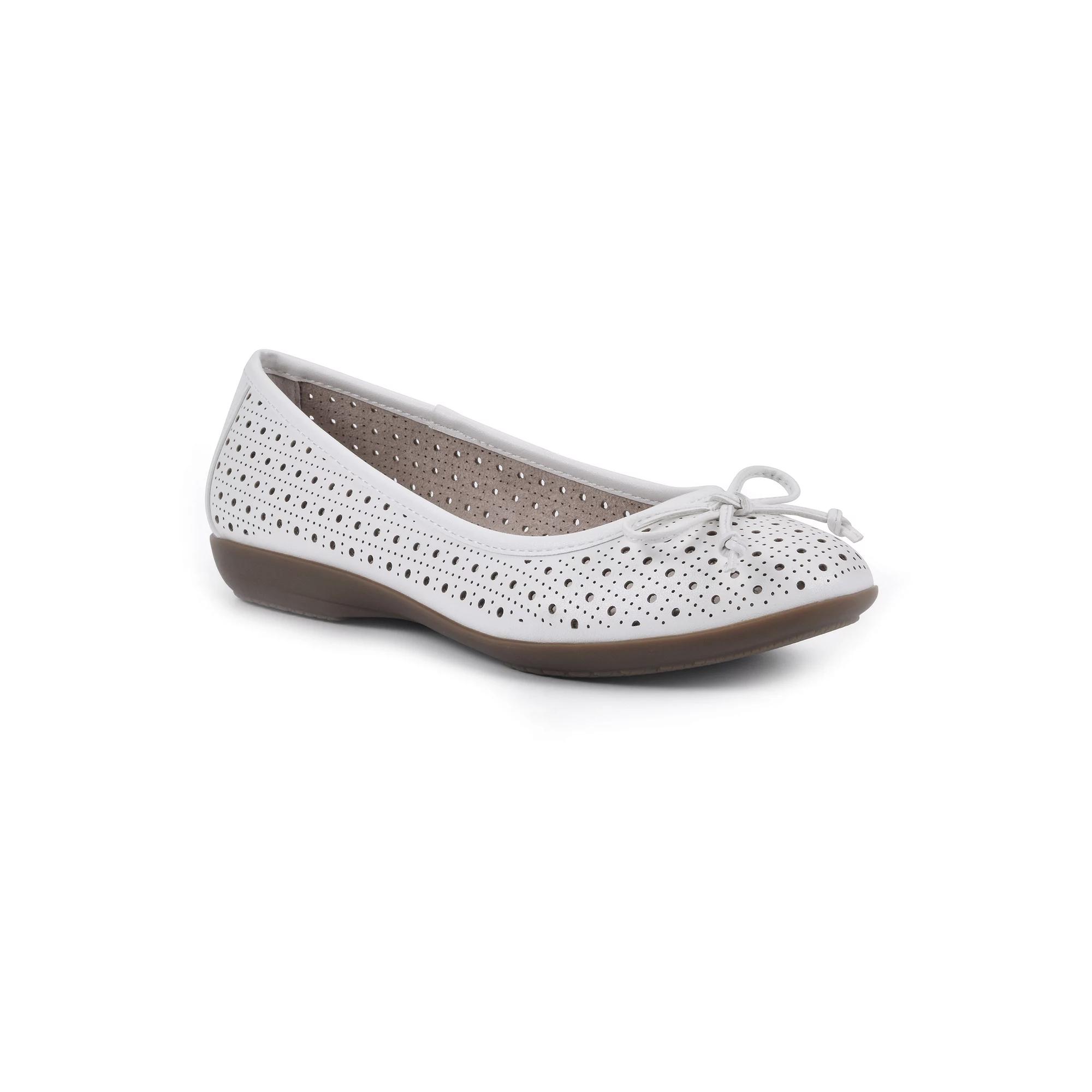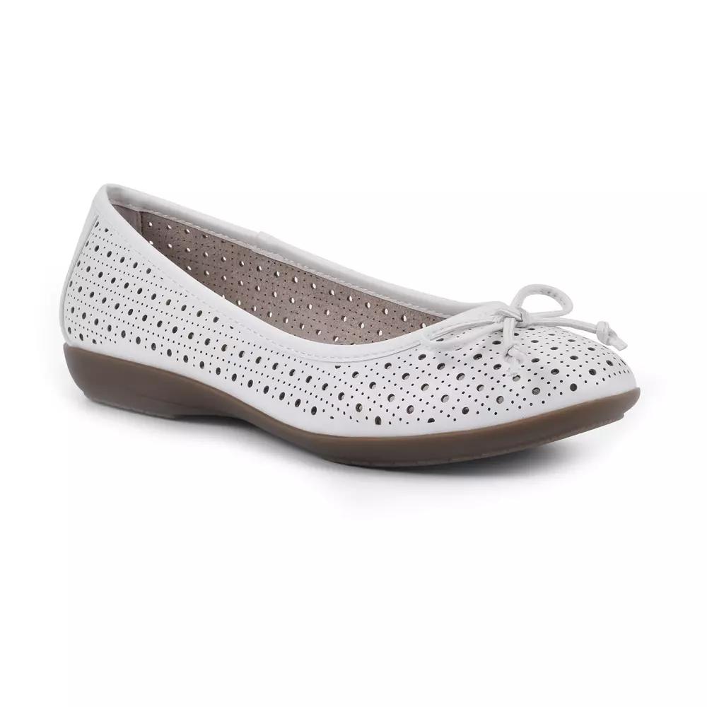 Step into style with these Cliffs by White Mountain Cheryl women's ballet flats. Click this FOOTWEAR GUIDE to find the perfect fit and more! - https://www.kohls.com/feature/shoesizeguide.jsp. SHOE FEATURES: Bow accent, Laser cut-out design, Comfortable cushioned insole, Flexible outsole. SHOE CONSTRUCTION: Polyurethane upper, Manmade lining, TPR outsole. SHOE DETAILS: Round toe, Slip-on, Padded footbed. Size: 9.5 Wide. Color: White Burnished Smo. Gender: female. Age Group: adult. Material: SYNTHETIC.