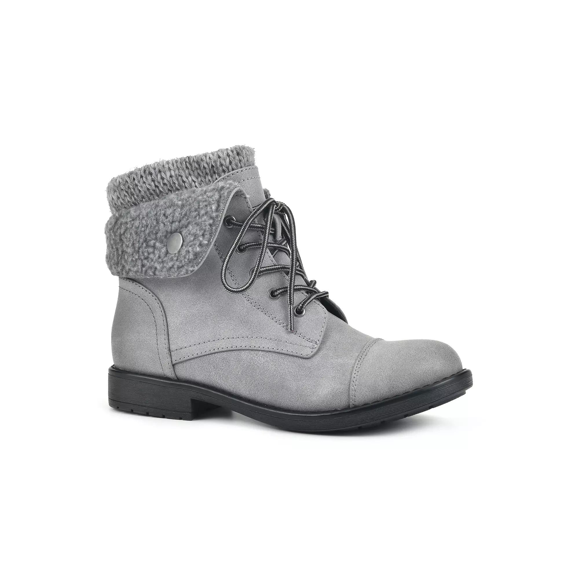You'll look stylish all-season long with these Cliffs by White Mountain Duena women's combat boots. Click this FOOTWEAR GUIDE to find the perfect fit and more! - https://www.kohls.com/feature/shoesizeguide.jsp. BOOT FEATURES: Sweater ankle trim design, Comfortable padded footbed. BOOT CONSTRUCTION: Textile, fabric upper, Jersey lining, Manmade outsole. BOOT DETAILS: Round toe, Lace-up closure, Padded footbed, 5.5-in. shaft, 10.5-in. circumference. Size: 9.5. Color: Light Gray. Gender: female. Age Group: adult. Material: SYNTHETIC.