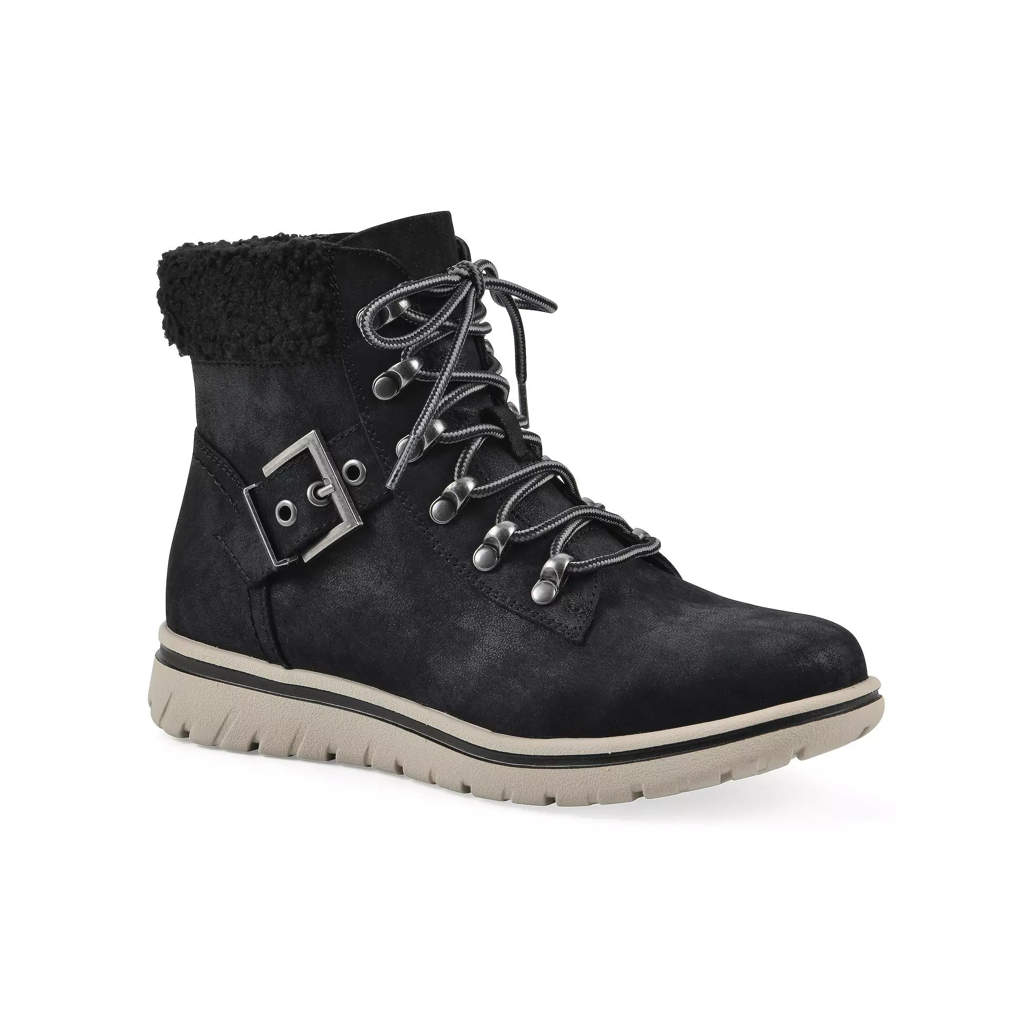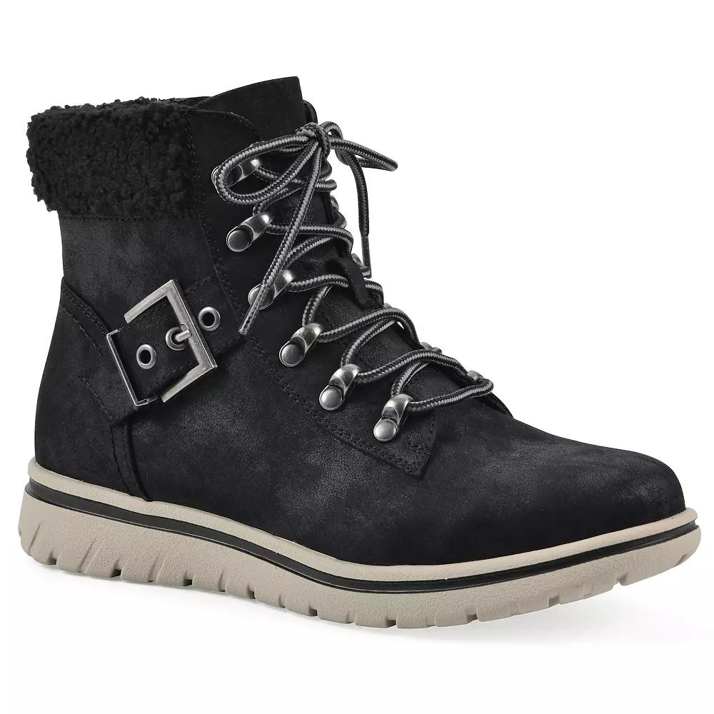 Adventure awaits with the Hadrian city hiker from Cliffs by White Mountain. Combining a plush faux sherpa collar and stylish buckle accents, these lace-up ankle boots ensure you're both comfortable and chic, whether you're on the trails or strolling through town. Click this FOOTWEAR GUIDE to find the perfect fit and more! - https://www.kohls.com/feature/shoesizeguide.jsp. FEATURES: Plush faux sherpa collar for added comfort, Secure lace-up front with functional inside zipper for easy wear, Buckle accents for a stylish utility edge, Cushioned insole for all-day comfort, Durable design suitable for both trails and urban environments. DETAILS: Round toe, Lace-up closure, 1" heel height, 1" platform height, Treaded outsole, Imported. FIT & SIZE: Low shaft, Ankle, 11" shaft circumference, 5" shaft height. MATERIAL & CARE: Textile upper, Foam footbed, Synthetic lining, Man-made outsole, Spot clean. Size: 9.5 Wide. Color: Black Fabric. Gender: female. Age Group: adult.
